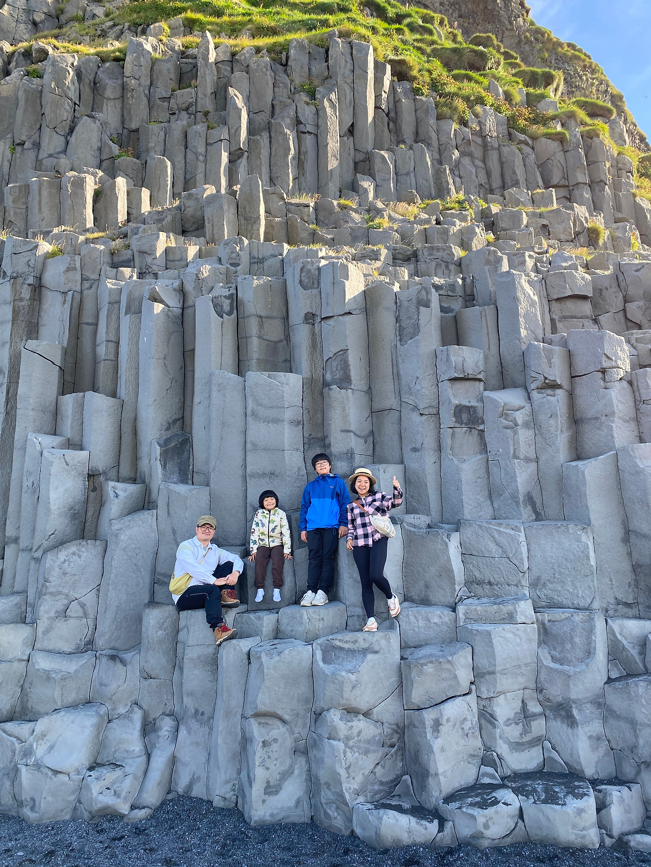 오늘도 날씨가 너무 따뜻하고 하늘은 파랗다. 아이슬란드 여행을 하면 2/3는 비나 눈이 오고 1/3만 파란 하늘을 볼 수 있다고 했는데 우리 가족은 날씨 요정을 데리고 다니나 보다. 루터 교회에서 차를 타고 10분 정도 이동해 해변 쪽으로 내려갔다. 레이니스피아라(Black Sand Beach Reynisfjara)라는 유명한 검은 모래 해변인데 해변 바로 앞에 주상절리와 동굴을 만날 수 있었다.