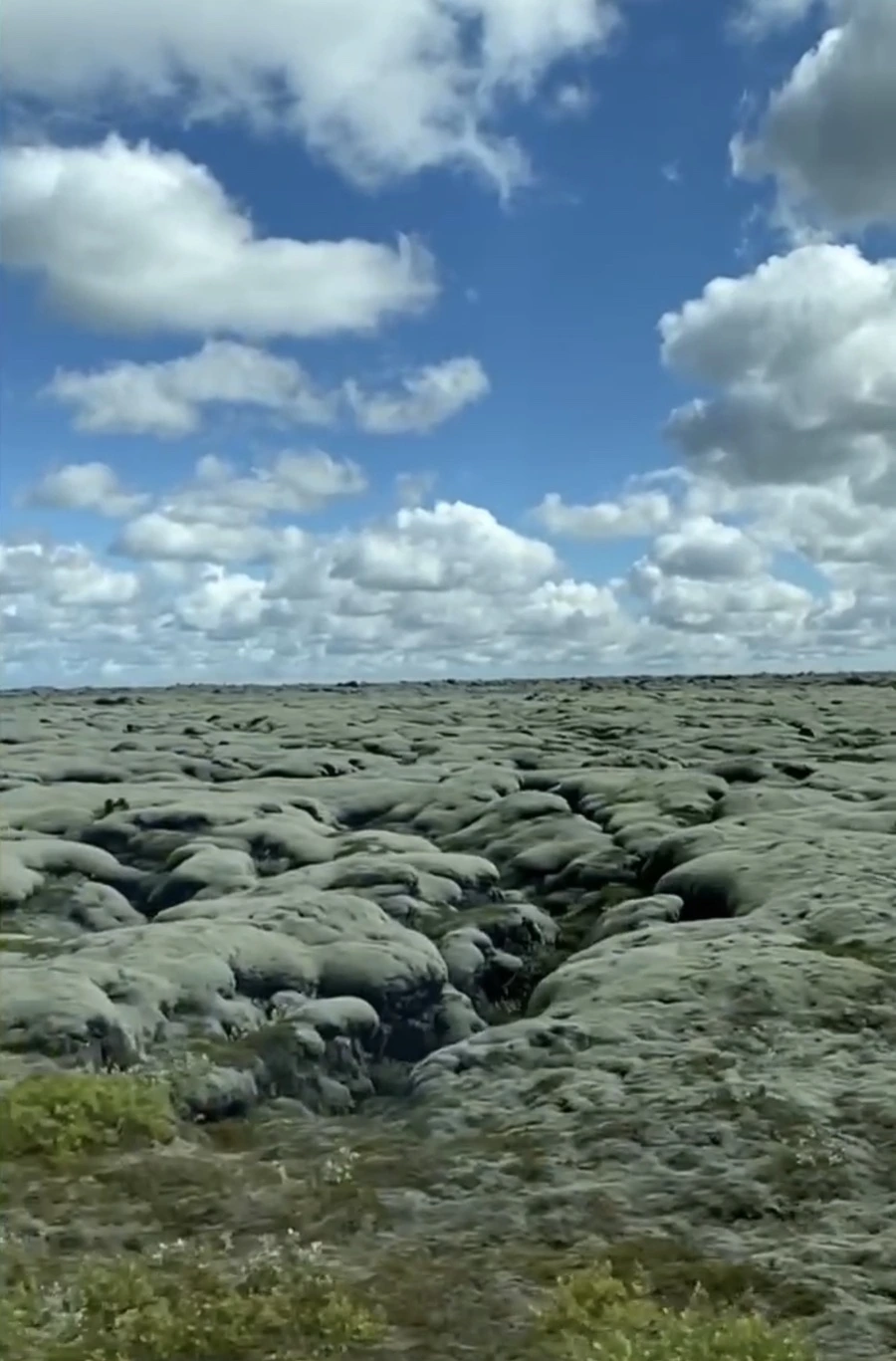 비크에서 2시간 정도 되는 거리를 달리는 차 창밖 풍경은 그야말로 지구 밖 풍경이었다. 다른 행성에 가본 적은 없지만 아마 우리가 우주선을 타고 다른 별을 탐사한다면 만날 수 있는 풍경이랄까? 아이들은 한 번도 본 적 없는 특이한 지형과 식물들을 보며 연실 탄성을 자아낸다. 인간의 흔적을 찾아볼 수 없는 드넓은 곳에 이상한 모양으로 덮여있던 건 바로 이끼였다. Gönguleið um Eldhraun이 지역은 화산이 폭발하고 용암이 이 땅 위를 다 덮으면서 현무암이 되었고, 다시 이 현무암 위에 이끼가 자라나 지금의 모습이 만들어져 지질학 공원으로 지정되어 있다. 이끼의 두께는 두껍게는 50cm 이상 되는 것도 있다고 한다. 이끼는 현무암에 뿌리를 내리고 서서히 현무암을 흙으로 만든다고 하는데 그러고 보니 화산 트레킹 갔을 때 아이들이 침대 매트리스처럼 푹신하다며 풀 더미 위에 누워 뒹굴뒹굴했는데 그것이 바로 '이끼 현무암 매트리스'였던 것이다. 아이들이 지구의 오랜 역사 위에 그것도 화산에서 그렇게 누워 놀았다는 게 지금 생각해도 너무 신기하기만 하다.