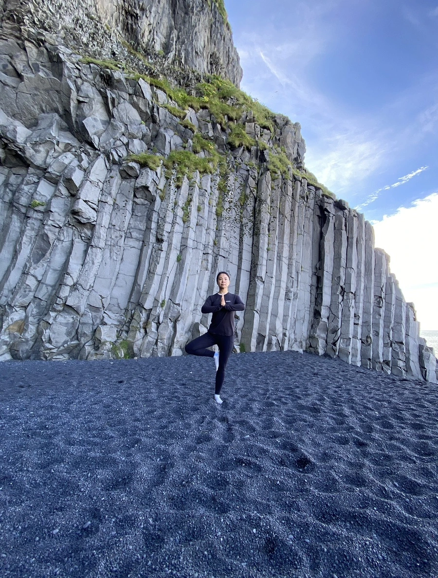 구라미 여행사 가이드님이 열심히 설명하시는 동안 난 살짝 빠져나와 검은 모래 위에 서서 바다를 바라봤다. 높은 파도로 유명한 곳이라는데 오늘 파도는 강물처럼 잔잔하다. 입고 온 셔츠를 벗어 검은 모래 위에 던졌다. 평평하지 않은 모래바닥이지만 몇 가지 요가 자세를 취해보며 잠시 명상에 잠겨본다.