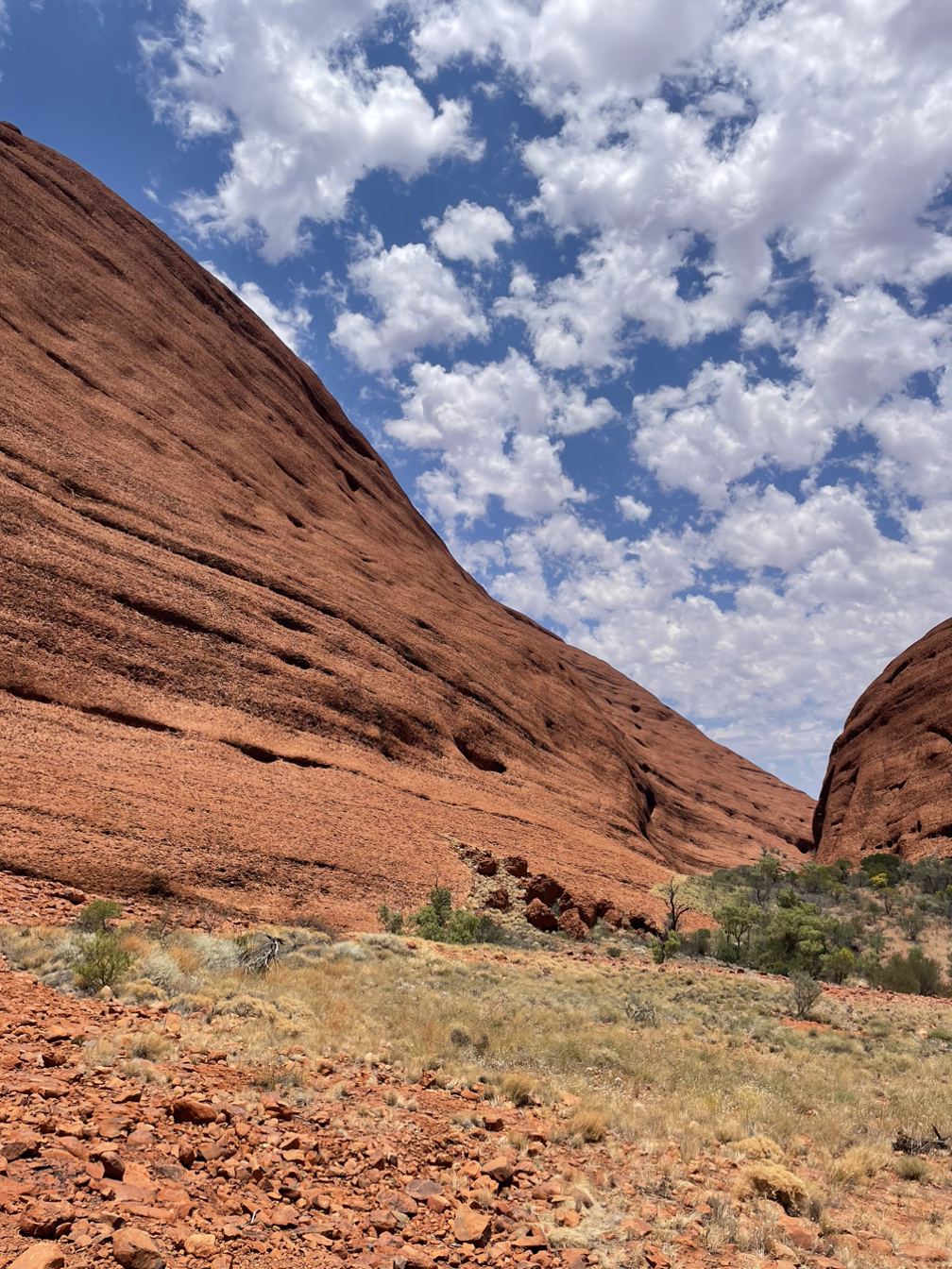 카타추타 바람의 계곡 입구 주차장에 들어서니 어제 천둥번개와 함께 비가 내려 군데군데 웅덩이가 파이고 침수가 되어 있다. 사막이라고 비가 오지 않는다고 생각하면 그건 오산이다. 울룰루 사막에도 아이슬란드에서 본 것처럼 아주 낮은 들꽃과 나무들을 많이 볼 수 있는데, 간간이 내리는 비의 영향 때문인 것 같다. 하지만 신의 땅과 같은 이곳에서 이 정도의 불편함 정도는 그냥 지나칠 수 있어야 한다. 웅덩이에 고인 물들은 곧 뜨거운 태양에 다시 증발하고 위태롭게 생명을 이어 나가고 있는 사막의 풀과 나무들에게 생명을 유지할 수 있는 유일한 희망일 수도 있다. 굳이 인간의 힘과 기술을 이용해 이곳을 편리한 도로나 시설로 포장하지 않았으면 좋겠다는 생각이 들었다.