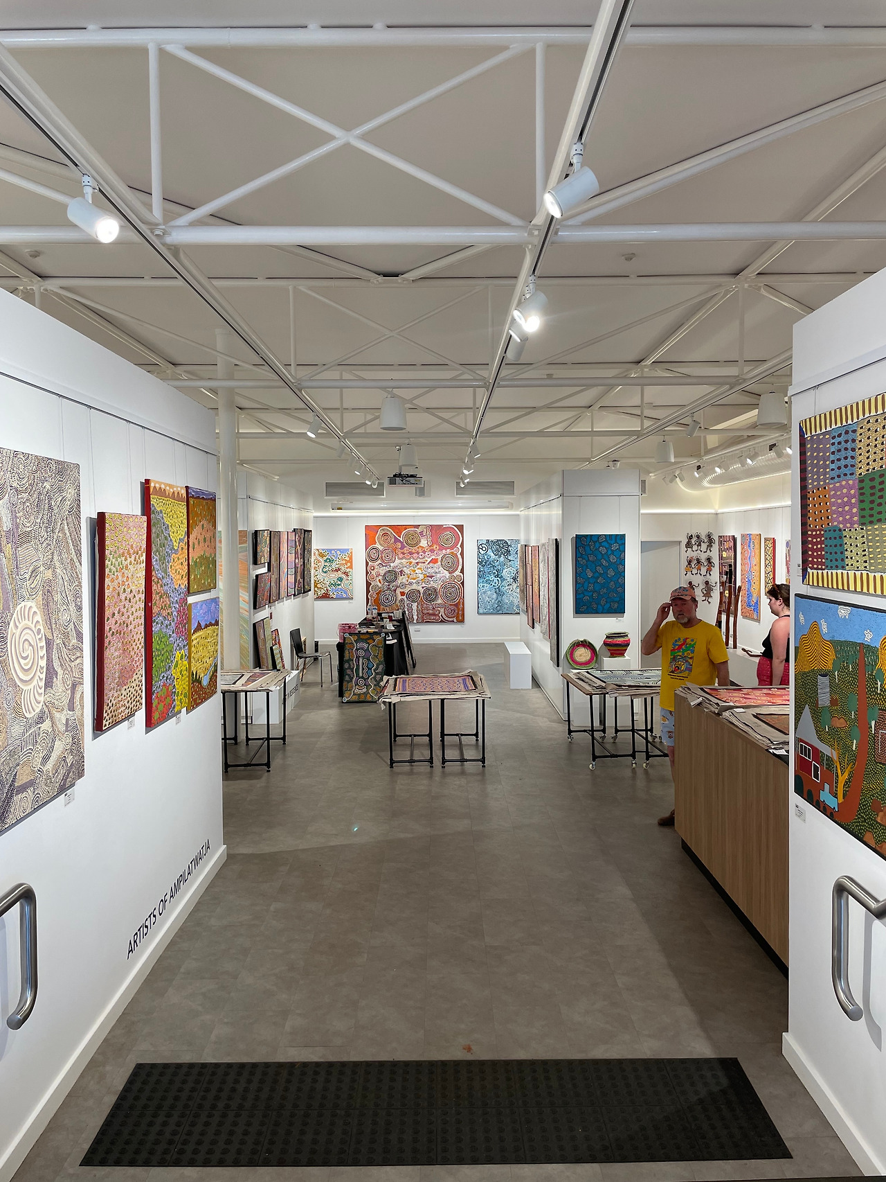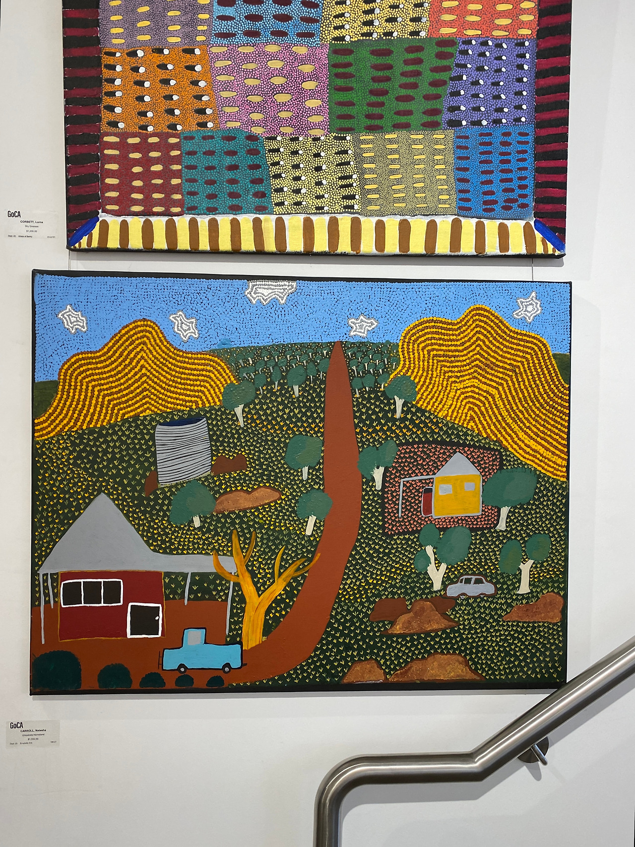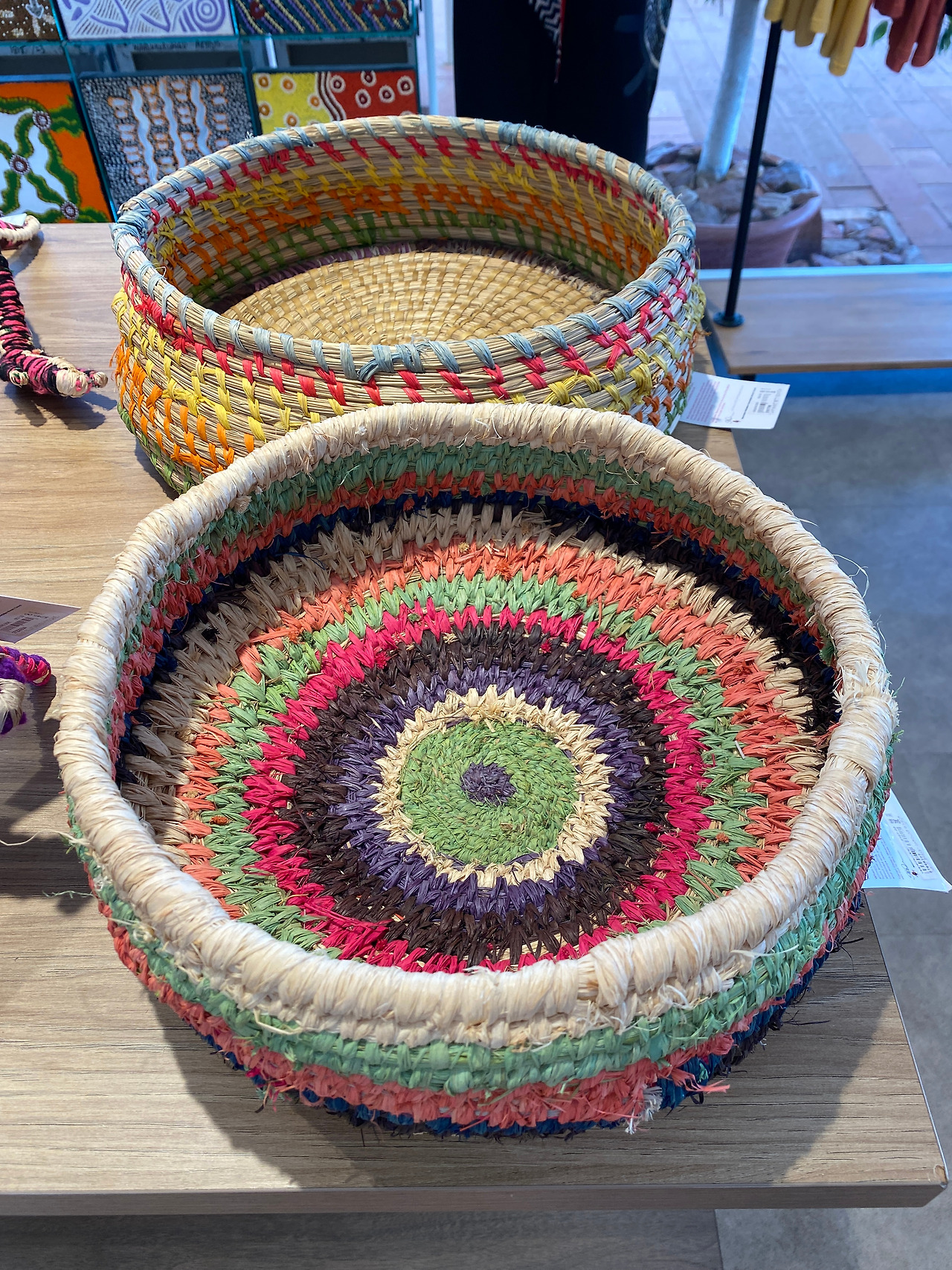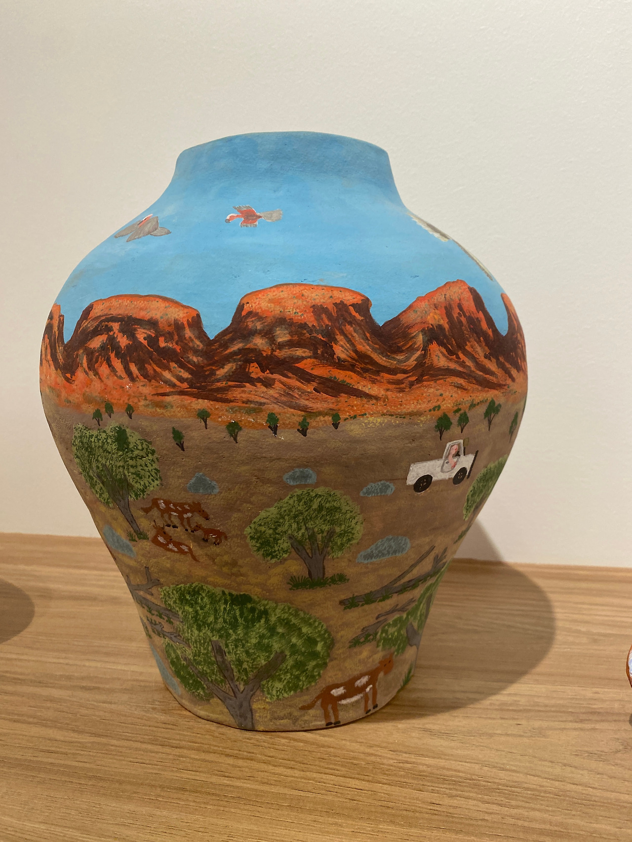 너무 뜨거워 적응 안 되는 아이들은 무작정 건물로 이어진 계단으로 뛰어 올라가 문을 열고 들어갔다. 소나기가 내리면 본능적으로 비를 피해 실내로 들어가는 것처럼 내리쬐는 태양을 피하는 방법은 시원한 에어컨이 돌아가는 곳으로 들어가는 것이다. 어쩌다 문을 열고 들어간 곳이 'GoCA(Gallery of Central Australia) 센트럴 호주 갤러리'였다. 들어가자마자 시원한 공기가 피부에 스민다. 시원한 공기 한 움큼 들이마시자, 색깔이 다양한 작품들이 눈길을 사로잡는다. 화려한 무늬의 페인팅과 조각들, 실로 짠 인형들과 카펫까지 화려하고 다양한 작품들이 전시되고 있었다. 갑자기 우리 가족은 피난객에서 작품 관람객이 되었다. 꽤 규모가 있는 이 갤러리의 작품들은 신진 작가들의 작품들을 많이 소개하고 있었는데 이들은 대부분 원주민들이라고 해 또 한번 놀랐다. 원주민들의 교육뿐 아니라 작가 양성을 위해 호주 정부에서 지속적인 노력을 하고 있다는 이야기를 들으니 왠지 모를 감동이 느껴졌다. 아마 극히 소수의 혜택일 수도 있겠지만 이들이 직접 이곳에서 작품 활동을 하고 판매하며 고객들과 소통까지 할 수 있도록 연결해 주고 있었다. 울룰루 등반이 결국 금지된 것, 울룰루 원주민들의 예술성을 인정하고 끊임없이 개발하려는 노력 모두 합의와 소통의 일부라는 생각이 들었다. 직접 작가를 만나지는 못해 아쉬웠는데 겹겹이 쌓여있는 그림 작품들은 테두리에 가격들이 표시되어 주인을 기다리고 있었다. 거대한 울룰루와 카타추타를 귀엽게 표현하기도 하고 사막의 식물들도 유니크해 보였다. 아프리카나 중동의 사막 느낌과는 또 다른 느낌의 울룰루를 확실히 느낄 수 있는 작품들이다. 실로 엮어 만든 도마뱀과 고슴도치 등의 동물들은 아프리카 짐바브웨에서 만난 얼룩말과 코뿔소 등 원주민이 바나나잎으로 만든 작품과 느낌이 비슷했다. 이들에게 동물의 의미는 뭔가 특별함을 가지고 있는 듯 보였다.