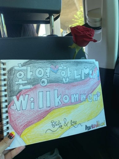 이미 유럽은 코로나로부터 자유를 찾은 듯 많은 인파가 공항을 출입하고 있었고 입국 수속하는 데 2시간이 넘게 걸렸다. 겨우 짐을 찾아 밖으로 나오니 민경 씨가 장미꽃 한 송이와 willkommen이라 쓰인 환영 피켓을 들고뛰어 온다. 나도 펄쩍펄쩍 뛰며 안아줬다. 눈물이 핑 돌았다. 6개월 만에 만난 건데 6년 만에 만난 사람들처럼 기뻤다.
