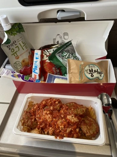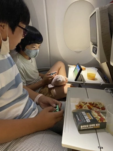 아시아나는 국적기라 여전히 기내 마스크 착용이 필수이다. 답답하지만 식사 시엔 벗을 수 있어서 눈치껏 식사 시간을 늘려가며 천천히 느긋하게 먹었다.