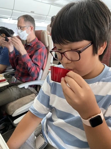 프랑크푸르트까지는 약 14시간이 소요된다. 러시아-우크라이나 전쟁이 지속되면서 하늘길도 돌아가야 하는 상황이 되어 두 시간 정도 더 걸리는듯하다. 장거리 비행이지만 오랜만에 비행기 타는 아이들은 신이 났다. 두 번의 식사와 두 번의 간식이 제공되는 총 4번의 밥차 (아이들은 어릴 때부터 기내식을 가리켜 밥차라고 불렀다. 새로운 여행지가 결정될 때마다 어린 환브로는 밥차가 몇 번 오는지 물었다. 밥차 등장 횟수에 따라 비행시간을 예상할 수 있는 아이들만의 계산법이었다.)가 온다고 하니 더 좋아한다. 아직 3학년인 려환이를 위해 미리 키즈 메뉴를 주문했다. (키즈 메뉴는 출국 36시간 전에 항공사 홈페이지를 통해 주문해야 서비스를 받을 수 있다.) 내가 다이어트 중이기도 해서 성인용 기내식을 려환이와 나눠 먹을 생각이었지만 기내용 키즈 밀은 다양한 간식이 포함되어 있어 아이들과 함께 장거리 비행기를 탈 예정이라면 한 끼 정도는 키즈밀을 주문하라고 추천하고 싶다. 부쩍 청소년으로 성장 중인 6학년 지환이는 요즘 한창 밀크티에 빠져 있다. 식사 후 제공되는 홍차에 우유와 스틱 설탕을 넣어 마시는 걸 좋아하는데 지켜보는 그 모습이 제법 분위기 있다.