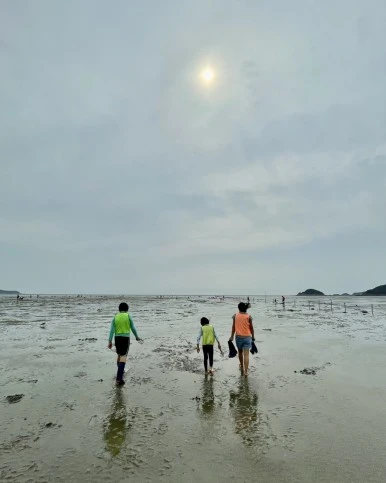 다행히 날씨가 뜨겁지 않아 갯벌체험은 고생스럽지 않았다. 하지만 양파망 한가득 열심히 호미질을 해 잡은 큼지막한 조개들을 독일로 가져갈 수도 강릉 집까지 가져갈 수도 없어 아이들은 아쉬워했다. 결국 체험 온 다른 가족한테 공짜로(?) 넘겼다. 그 풍성한 망을 받은 가족의 표정이 '심 봤다'였다. 갯벌에서 입었던 진흙으로 엉망이 된 옷은 대충 헹궈 봉지에 넣은 후 강릉으로 돌아가는 신랑에게 넘기고 우리의 짧은 인천 갯벌 체험은 마무리했다.