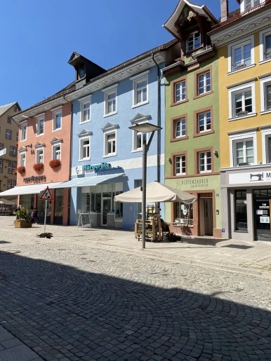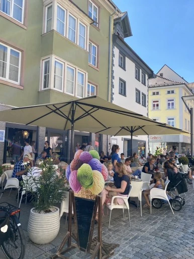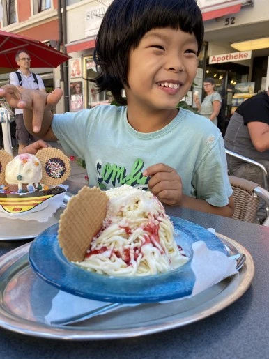 늘어선 상점들의 쇼윈도를 구경하며 울퉁불퉁 돌바닥을 따라 걷다가 아이들이 아이스크림 사인을 보더니 걸음을 멈춘다. 그러고 보니 유난히 아이스크림 가게가 많다. 거의 모든 카페와 식당은 외부 테라스 테이블이 함께 있는데 우리도 밖에 앉기로 했다. 독일로 이주한 지 6개월뿐이 되지 않은 꼬마 숙녀들이지만 한국에서 온 환브로를 위해 독일어 메뉴도 설명해 주고 유창하게 주문도 해준다. 환브로는 윤서와 예윤이의 독일어가 신기하면서도 웃긴가 보다. 주문을 성공적으로 한 예윤이의 표정이 자신만만하다. 아이들이 주문한 꼬불꼬불 스파게티 모양의 아이스크림이 나왔는데 정말 비주얼이 그럴싸하다. 나는 시원한 아이스 아메리카노를 원했지만, 알고 있었다. 유럽 카페엔 아이스가 없다는 걸,, 독일이라고 예외는 아니었다. 유럽에선 아이스커피를 시켜도 얼음이 없다. 심지어 아이스크림 커피를 준다. (달달한 냉기 있는 카페라테) 유럽에서의 아이스커피는 coffee+ice cream 인가 보다. 그래서 iced coffee please~ 하면 그냥 차가운 커피를 준다. 민경 씨도 독일에 와서 가장 그리운 것 중 하나가 한국 카페의 아아 (iced Americano)라고 했다. 더운 여름날에 미지근한 커피라니.... 마치 엄청 더운 날 살얼음 없는 미지근한 물냉면을 마주하는 기분이라고나 할까? 우린 미지근한 라테 한 잔으로 만족해야 했지만, 테라스의 햇살과 가끔 불어오는 시원한 바람으로도 충분히 만족스럽긴 했다.