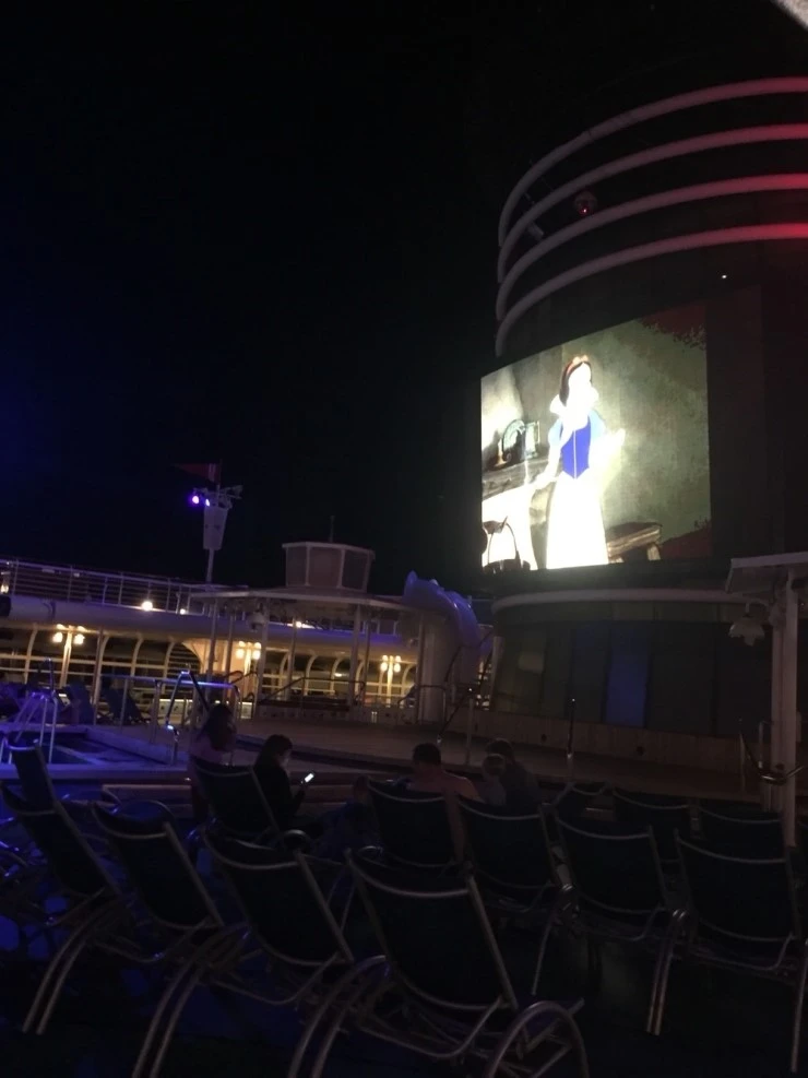 큼직한 페페로니 피자와 치즈 피자 한 조각씩을 플라스틱 접시에 받아 들고 갑판 위로 나갔다. 시원한 바닷바람이 더웠던 낮의 열기를 식혀주고 있다. 갑판 위 커다란 전광판은 야외 극장으로 변신해 백설공주가 상영 중인데 아주 오래돼 보이는 필름이다. 밤 10시가 넘은 시간이라 영화를 보는 사람들은 거의 없다. 승객들보다 하루의 일과를 정리하고 수영장을 청소하는 크루즈 직원들이 눈인사를 하며 지나간다. 그 사이로 썬배드에 누워 영화를 즐기고 있는 백발의 노부부가 눈에 들어왔다. 특별한 대화 없이 그저 편안하게 영상을 감상하고 계신 모습을 보니 갑자기 울컥한다. 이럴 땐 너무 감상적인 내가 너무 주책이다. 하지만 밤하늘에 떠 있는 수많은 별들과 간간히 불어오는 바닷바람, 잘 알아듣지는 못하겠지만 음악보다 아름다운 오래된 듯한 영화 속의 목소리는 유년 시절을 회상하며 늙어지고 느려진 노부부에게 완벽한 위로가 되어 주는 듯했다. 나도 뒤편에 마련된 썬베드에 기대어 앉았다. 피자를 한 입 물고 나의 유년시절을 떠 올렸다. 내가 어릴 땐 뭐 하고 놀았지? 어떤 만화 영화를 봤었지? 그러고 보니 두 아이를 키우면서 뽀로로와 로보카폴리에 익숙해져 나의 유년시절에 즐겨보던 만화를 본 지 오래다. 눈은 백설공주를 향해 있지만 어느새 나의 머릿속엔 빨간 머리 앤과 소공녀 세라가 그려지고 있다. 저절로 입가에 미소가 지어지고 마음도 몽글몽글해진다.