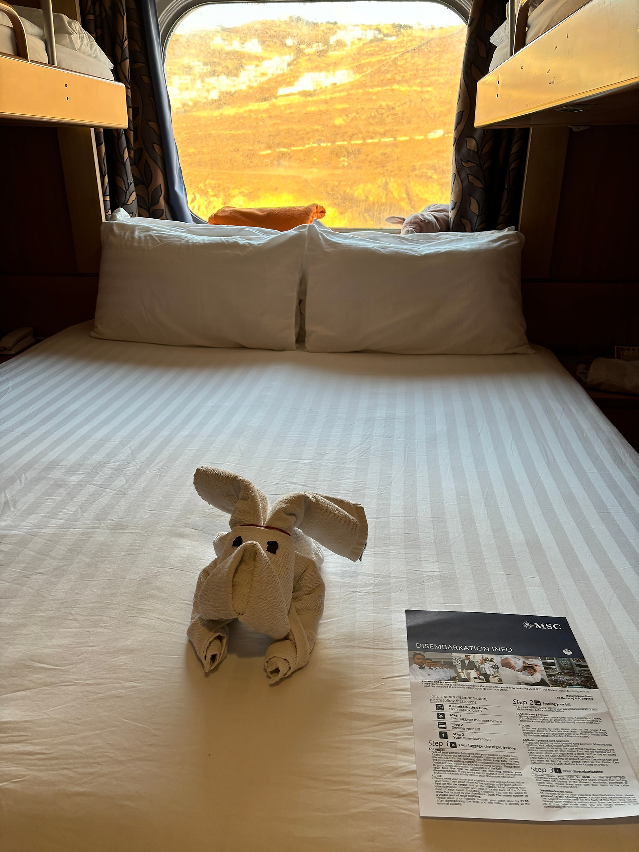 그날 오후 미코노스 관광을 마치고 선실로 돌아오니 귀여운 멍멍이와 그 옆엔 '하선 안내서'가 놓여 있었다.