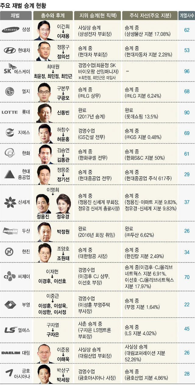 국내 재벌이 가족 승계를 하는 이유는 두가지로 꼽힌다. 지분이 적더라도 복잡한 순환출자 등을 통해 훨씬 더 많은 영향력을 유지할 수 있다면 총수일가는 이대로 승계하는게 이익이다. 또 승계 구도에서 떨어져 나간 총수 일가에게 작은 회사라도 만들어 일감을 챙겨주려면 대기업집단을 유지하는게 유리했다. 강정민 경제개혁연대 연구원은 “무리수를 둘 위험이 있는 대표적인 곳은 한화, 한진, 현대중공업 등이다”고 말한다.