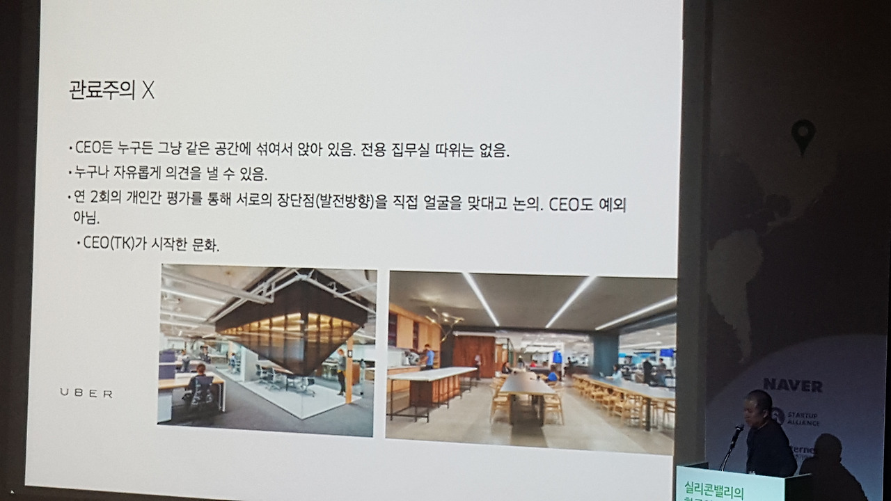 우버의 안드로이드폰 개발을 맡고 있는 이태원씨는 우버의 문화에 대해 설명했다. 우버는 직원에 대해 철저히 신뢰한다고 했다. 투명하게 정보를 공개하고 있으며 매주 전 직원이 모이는 미팅을 갖는다고 했다. 이 자리에서 CEO와 질의응답을 주고 받을수도 있다. 분기별로는 CFO가 회사의 경영상태에 대해 브리핑을 한다. 재무제표나 현금흐름 등 모든 정보를 공개한다고 했다.