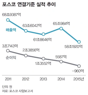 포스코가 지난해 창사 이래 처음으로 적자를 냈다. 포스코는 포항제철 때부터 국내 1위 철강업체로 그동안 적자를 낸 적이 한번도 없었다. 2015년 경영실적은 연결재무제표(계열사까지 통합해 자본과 이익 등을 따지는 재무제표) 기준으로 당기순손실 960억원을 기록했다. 매출액은 58조1920억원으로 2014년에 견줘 큰 폭(10.6%)으로 감소했다.