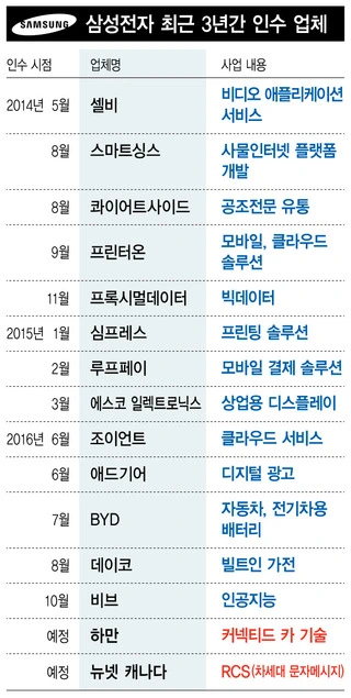 앞서 삼성전자는 미 클라우드 서비스업체 조이언트와 캐나다 디지털광고 스타트업인 애드기어를 인수했다. 중국 전기차 업체 비야디(BYD)에도 30억위안을 지분 투자했다. 인공지능(AI) 플랫폼 개발 기업인 비브랩스도 사들였다.미국 실리콘밸리에서 삼성전자와 일한 경험이 있는 한 관계자는 “사물인터넷은 물론 하드웨어와 소프트웨어의 연계가 삼성의 인수합병 원칙이다”고 전했다. 삼성전자가 반도체와 스마트폰 등 하드웨어에서 강점이 있는데 이와 결합할 만한 소프트웨어 기업에 관심이 많다는 설명이다. 비브랩스를 인수한 것도 삼성 스마트폰에 인공지능에 기반한 대화형 비서 소프트웨어를 새로 탑재하기 위해서다.