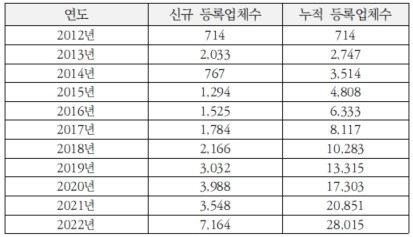 화장품제조업체, 화장품책임판매업체, 맞춤형화장품판매업체 등록현황은 식품의약품안전처*에서 제공하는 정보를 통해 확인할 수 있다. 화장품 제조업, 제조판매업 등록은 1년간의 등록 유예기간을 거쳐 2013년 2월 의무화되었다. 따라서 2012년 3월에서 2013년 2월까지 등록된 업체들 중 다수는 기존에 이미 화장품 사업을 진행하고 있던 업체들이었을 것으로 보인다. 2013년 3월 이후 등록된 것으로 나타나는 업체들이 신규 등록 업체일 것이다. 이 시기에 화장품법 시행규칙 개정안에 의해 화장품업 관리제도가 기존 제조업, 수입업의 2종에서 제조판매업, 위탁제조 수입업 등으로 세분화되었다. 이로써 화장품 유통환경 변화에 따라 브랜드만 보유하고 화장품 제조를 OEM 업체에 위탁하는 판매전문기업 등장에 대한 법적관리 근거가 마련되었다.