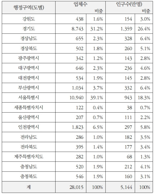화장품 골드러시의 광부들은 어디에서 곡괭이질을 하고 있을까? 쉽게 예상할 수 있지만 서울특별시에 전체 화장품책임판매업체의 39.1%인 10,940개가 몰려있다. 서울특별시는 전국 인구수 5144만명 중 18,3%인 943만명이 살고 있는데 업체 비중은 훨씬 높다. 그 다음으로 경기도에 31.2%인 8,743개 업체가 있고, 인천에는 6.5%인 1,823개 업체가 있다. 서울특별시, 경기도, 인천광역시의 업체수 비중은 전체의 76.8%이다. 이 세 지역은 인구수 비중 대비 업체수 비중이 높다. 화장품 창업이 가장 활발하고, 경쟁도 가장 치열한 곳이라 하겠다.