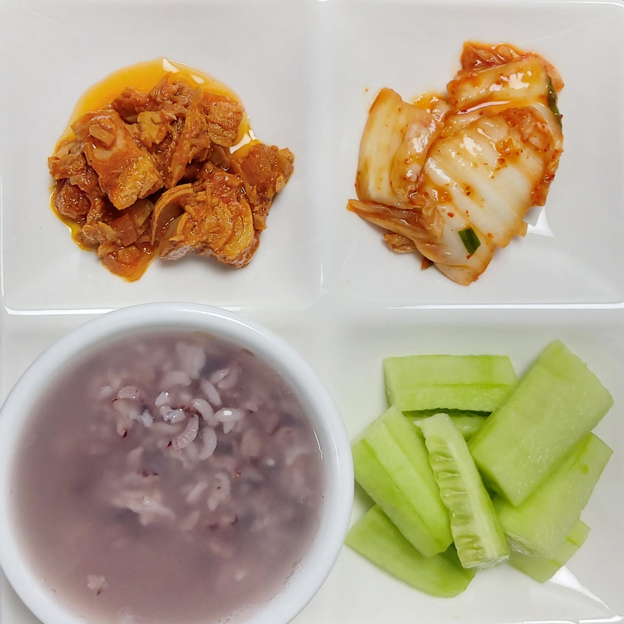 종일 안 움직일 예정이라 죽으로... / 죽 / 김치 / 오이 / 참치캔 (죽은 조금 더 퍼먹음)
