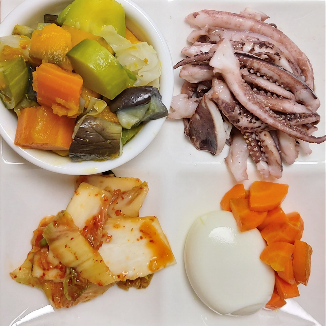 찐 야채 (가지, 호박, 단호박, 당근, 양배추) / 오징어 / 김치 / 당근(후라이팬에 기름 두르고 구운) / 계란