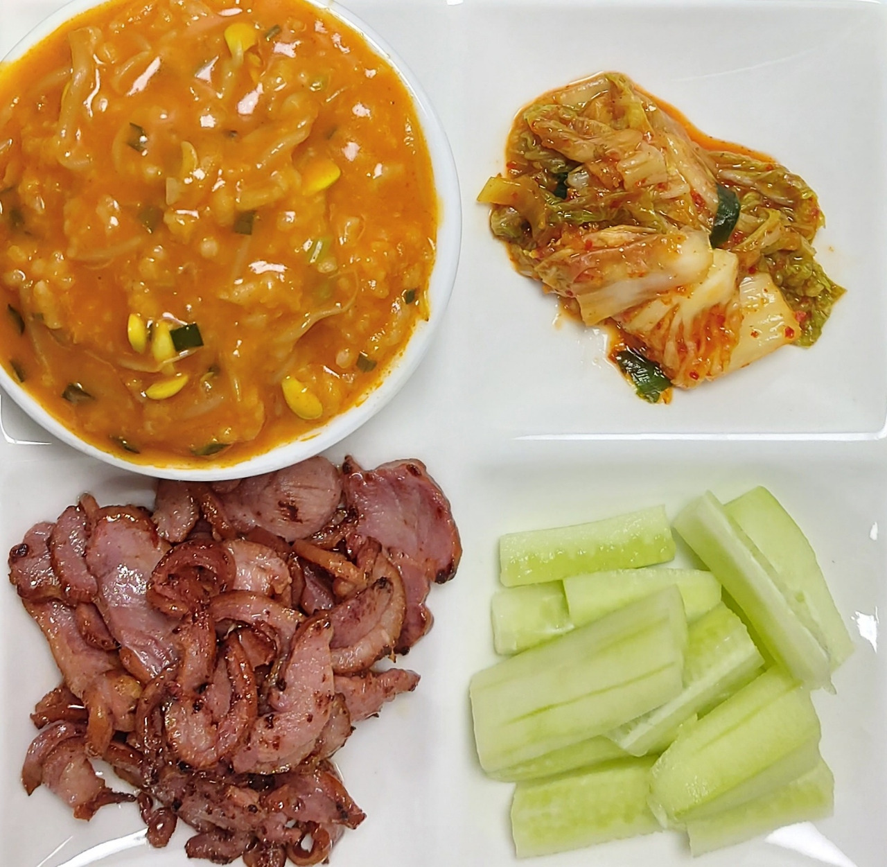 오이 / 매생이죽 / 맛살(한 봉지를 다 담느라고 애썼다, 그래도 145칼로리) / 젓갈과 김치(죽 살 때 준 반찬)