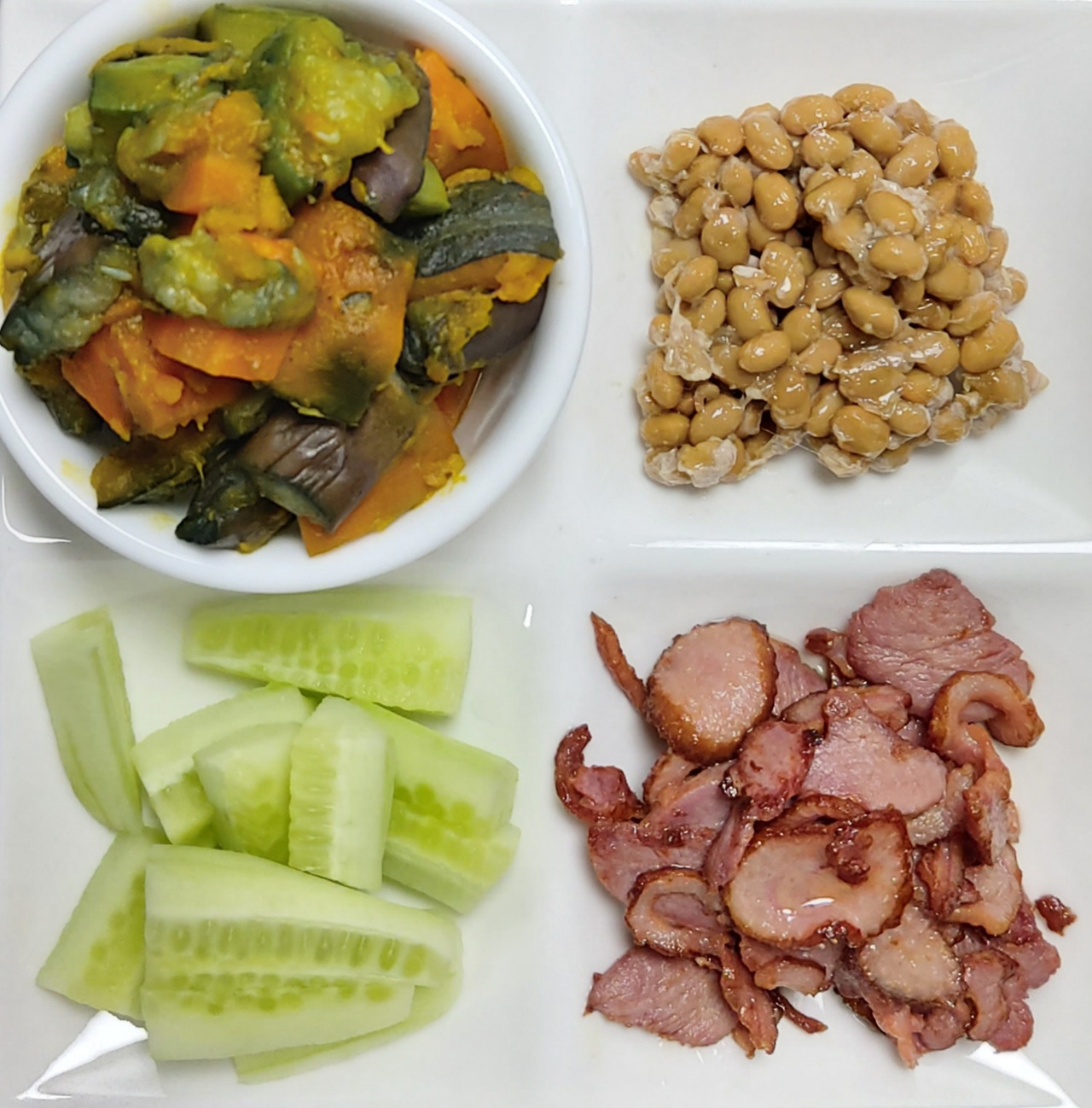 찐야채(단호박, 당근, 가지, 호박) / 나또 / 오이 / 훈제요리 (남은 게 양이 흡족치 않지만, 저녁에 수육을 먹을 예정이므로 이 정도만 먹음)
