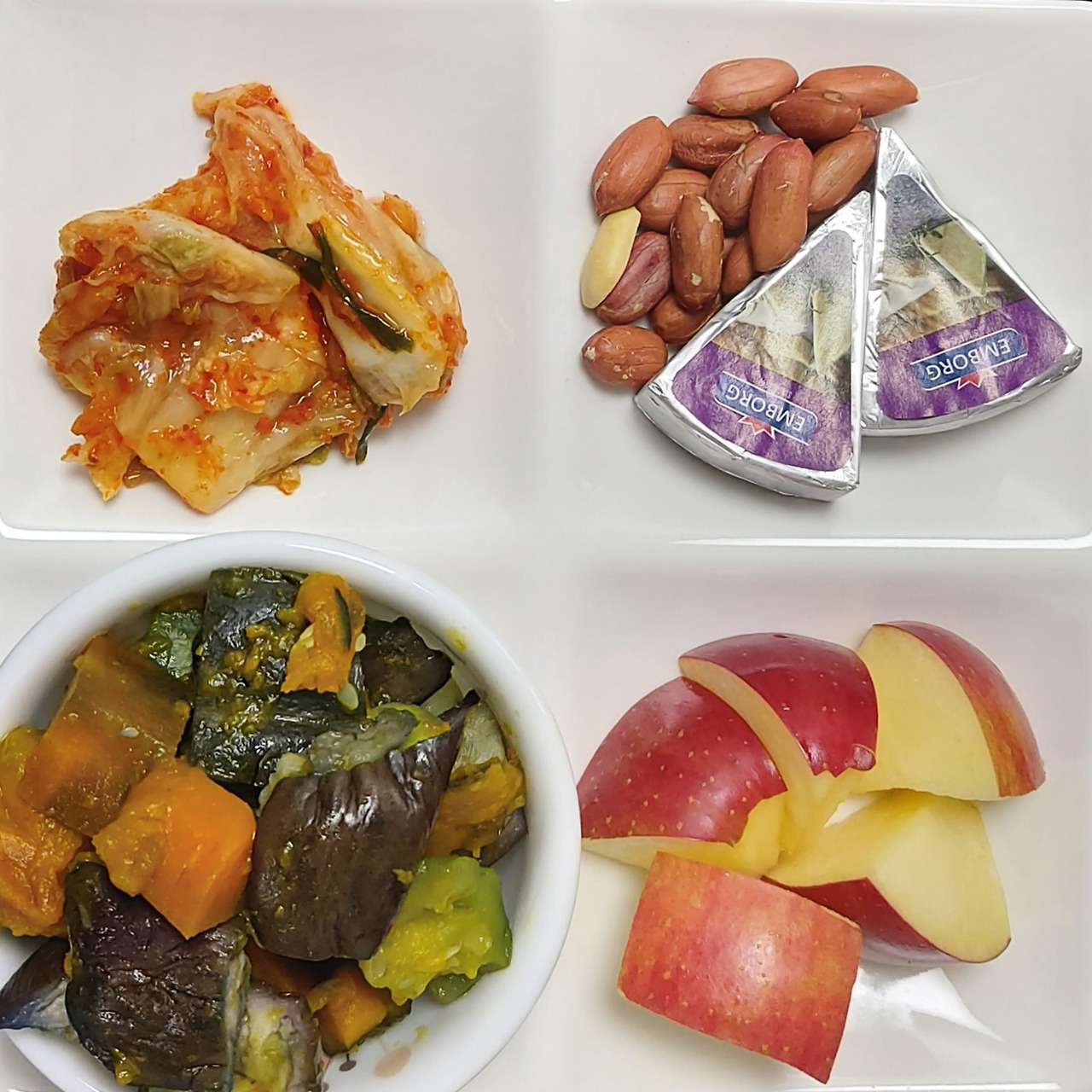 찐야채 (단호박, 호박, 당근, 가지) / 사과 / 치즈 / 땅콩 / 김치