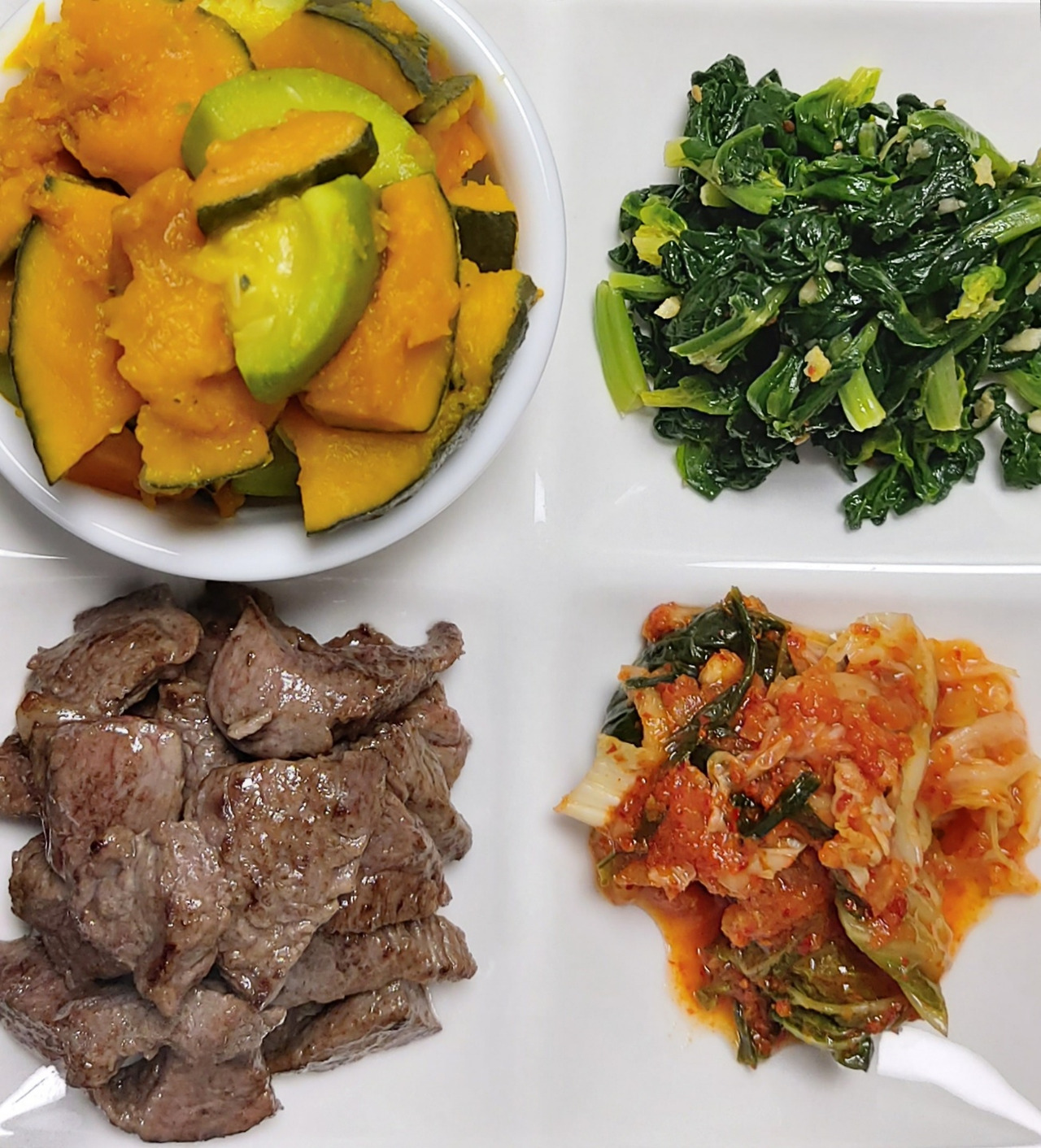 찐 야채 (단호박, 호박, 당근) / 시금치 / 등심구이 / 김치