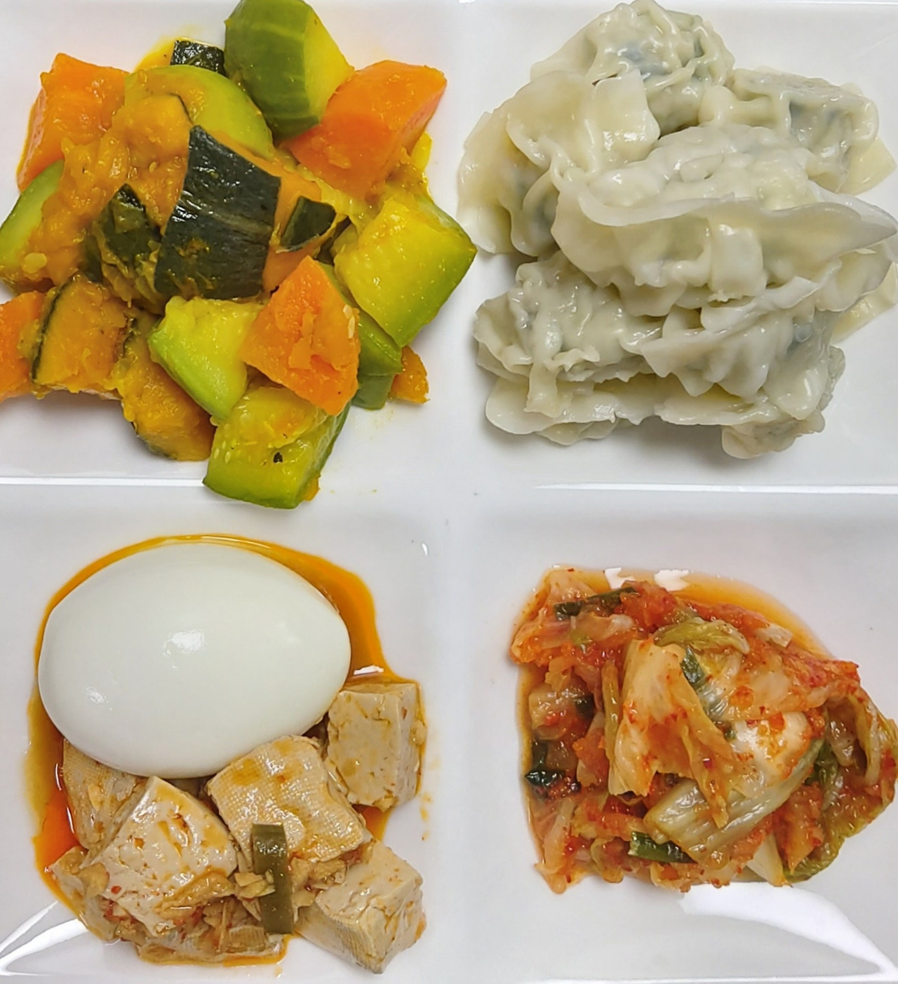 찐 야채 (단호박, 호박, 당근) / 만두 / 계란 반숙 / 두부조림 / 김치