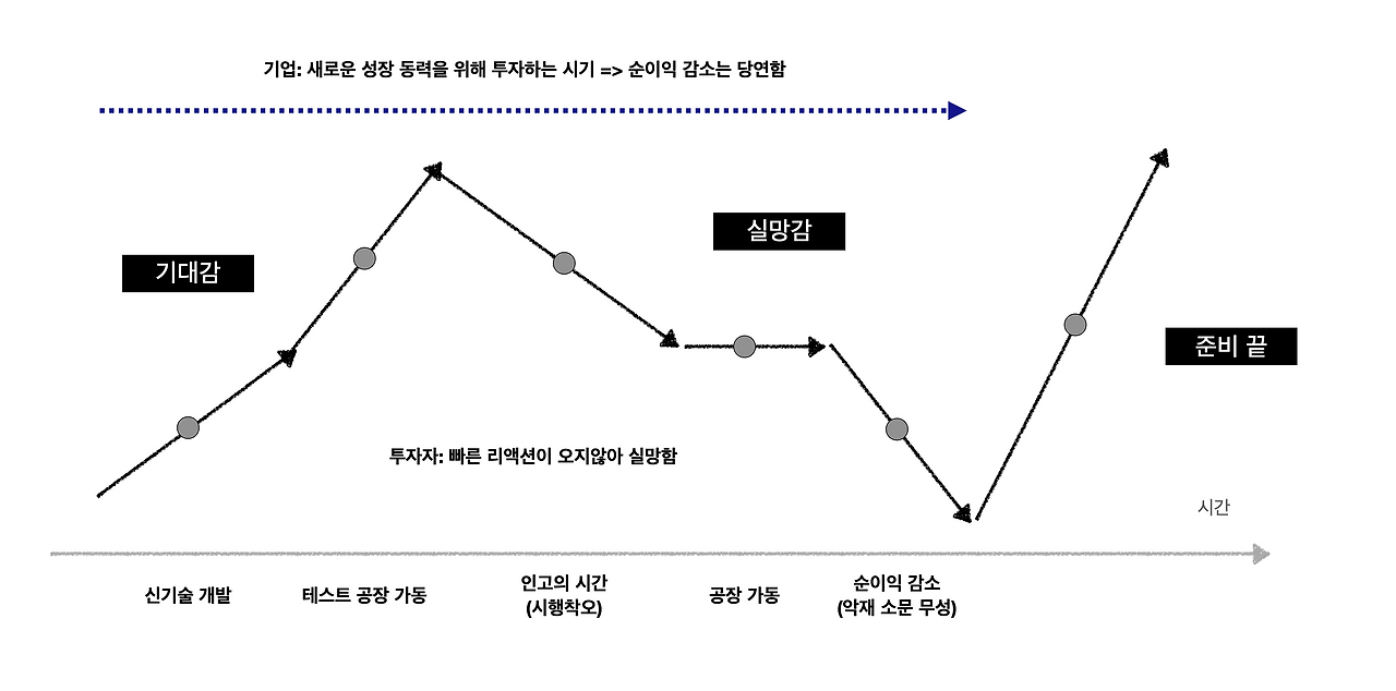대부분의 주가 흐름은 위와 같이 흘러간다. 이 그림을 보면 언제 매수해야 되는지를 단번에 알 수 있다. 상업적인 생산에 들어가는 시기부터 주의 깊게 보다가, 펀더멘탈은 그대로인데 사람들의 실망감이 과도하여 떨어지게 되는 순간이다. 기업이 잘 일하고 있다면, 단순히 순이익 감소로 평가해서는 안된다. 기업의 가치를 보아야 한다. 즉, 기업의 가치는 상승하고 있는데, 가격이 떨어지는 시점이 곧 매수 시기이다. 경영진이 우수하다면 하락은 일시적이다. 물론 이를 위해서는 인내심이 필요하다.