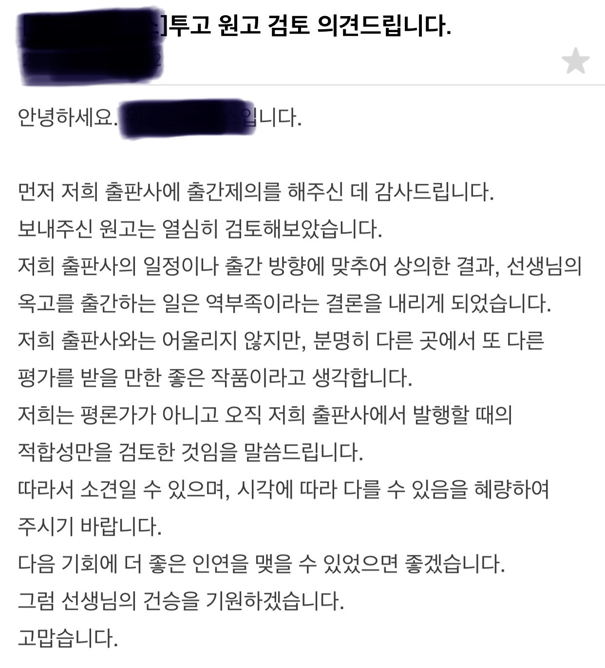 "보내주신 원고 보고 기쁜 마음으로 연락드립니다. 출간 관련하여 논의하고 싶습니다."
