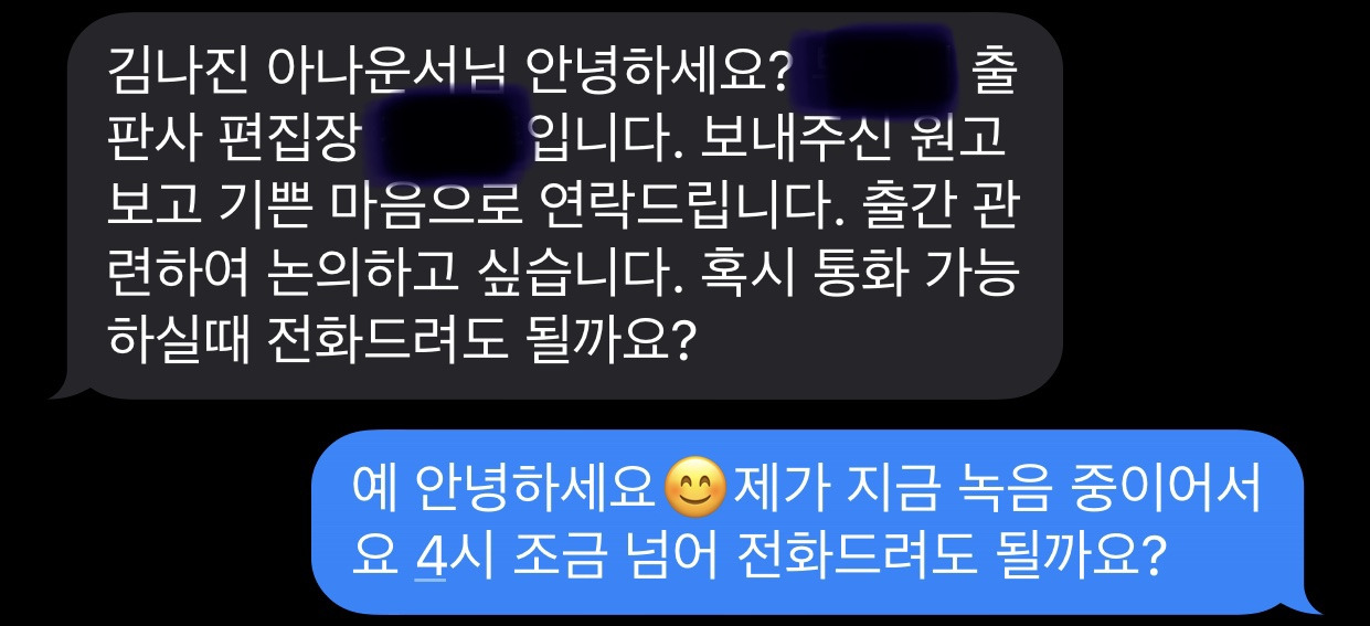 꿈 덕분에 기분 좋게 출근해선 이런저런 일들을 처리하고 있었다. 라디오 프로그램 녹음을 한참 하고 있는데 모르는 번호로 문자가 왔다. 불과 하루 전 투고했던 출판사 편집장으로부터 날아온 낭보였다.