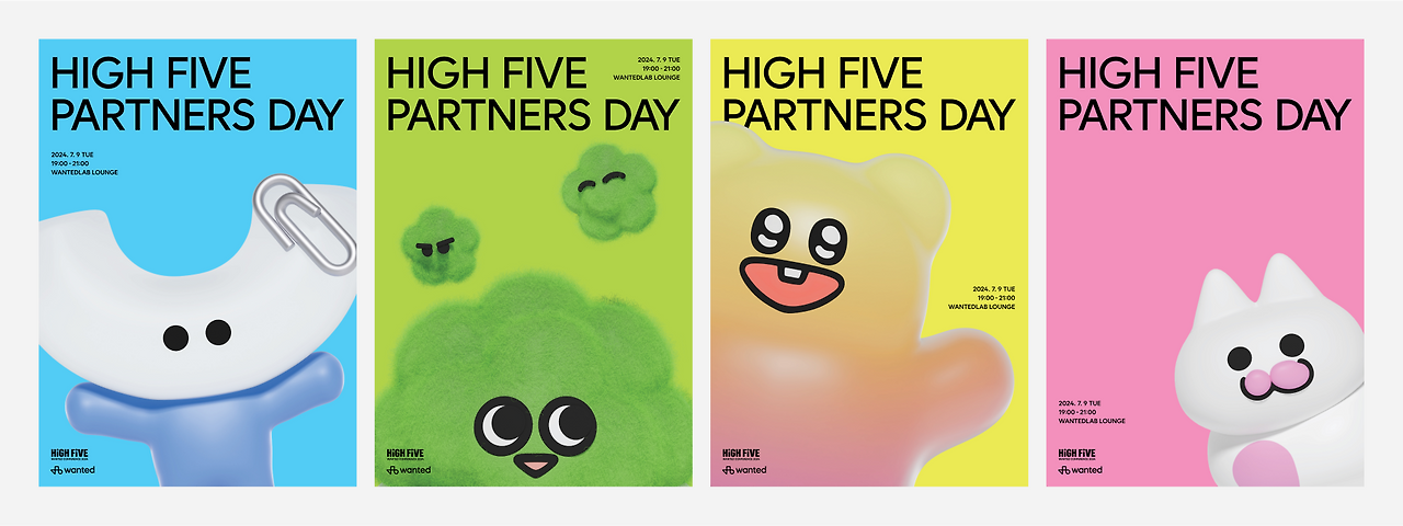 지난 5월 진행됐던 하이파이브 2024(이하 ‘하이파이브2’)에서 원티드의 새로운 캐릭터들이 열일(?) 하고 돌아왔는데요. 컨퍼런스 공간 기획과 브랜딩을 준비하는 동시에 3D로 형태를 빚어내고 캐릭터별 모션의 특징을 부여하는 등 여러 손길을 거쳐 메인 비주얼로 무대에 나선 것이었는데요. 대상 직군도 확장된 하이파이브2가 성공적으로 마무리된 만큼 고군분투하며 준비했던 이야기를 들려드릴까 합니다.