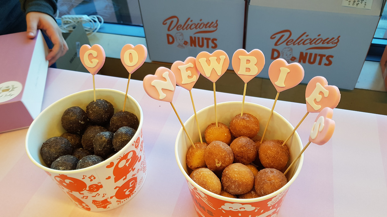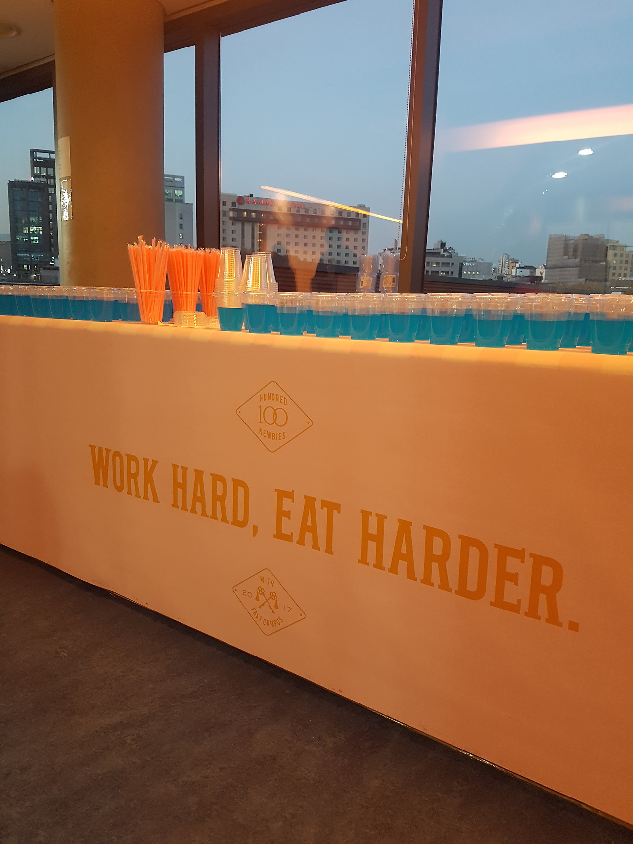 원티드의 리크루팅 행사는 먹을 것을 빼고 이야기할 수 없습니다. 이번 행사도 역시 다양하고 맛있는 음식들이 준비되어 있었어요. GO NEWBIES라고 적힌 도넛, ‘합격’ ‘취업’ ‘첫 직장’이 적힌 컵케이크, 크리에이티브 파워 주스 등, 구직자들의 마음까지 생각한 스낵으로 구비했습니다. 배가 든든해야 채용 행사에도 최선을 다해 임할 수 있겠죠?
