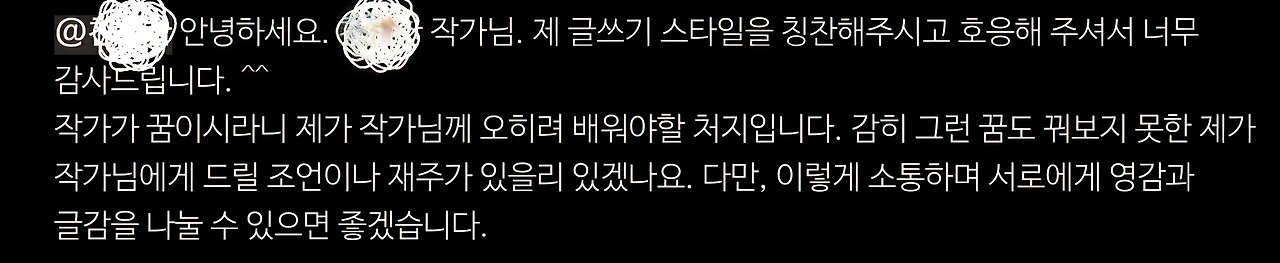 그래도, 내게 첫 댓글을 달아준 고마운 '은인님'이시니까. 자신도 작가를 꿈꾼다고 하잖아. 단지 우리말이 좀 서툰 것뿐일 테지.... 나는 믿고 싶었다.