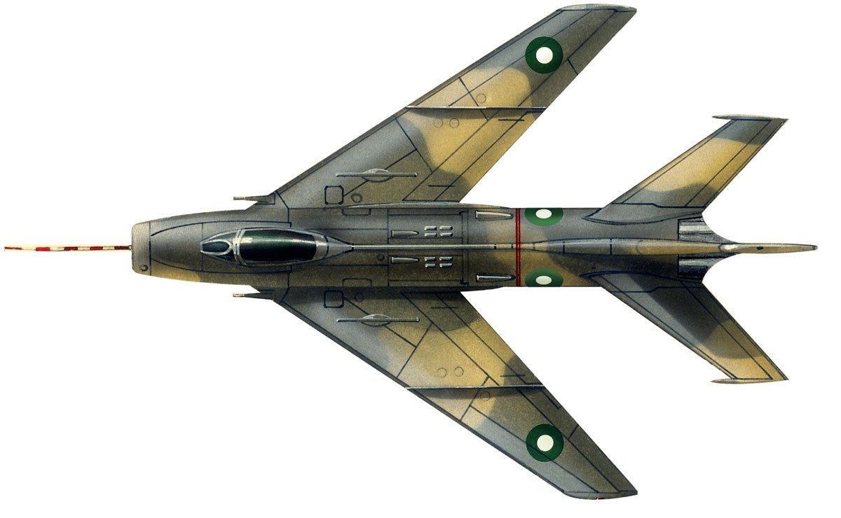 *파키스탄의 미그 19, 중국에서 사 온 거라, 북한도 이와 똑같은 기체다. 동체와 날개가 붙은 지검의 뾰족한 건 30밀리 기관포. 출처: img.wp.scn.ru