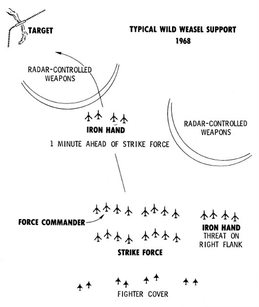 맨 앞으로 나가는 게 전자전 공격기다. F-105 G 야생 오소리(와일드 위즐) 편대. 가장 위험한 임무다. 전(前) 편에서 설명했지만, 선봉으로 가면서 적의 전파를 재밍하고, 더 나아가 그 기지와 미사일을 부순다. 주 무기는 대(對) 레이더 미사일인 슈라이크와 햄(HARM).
