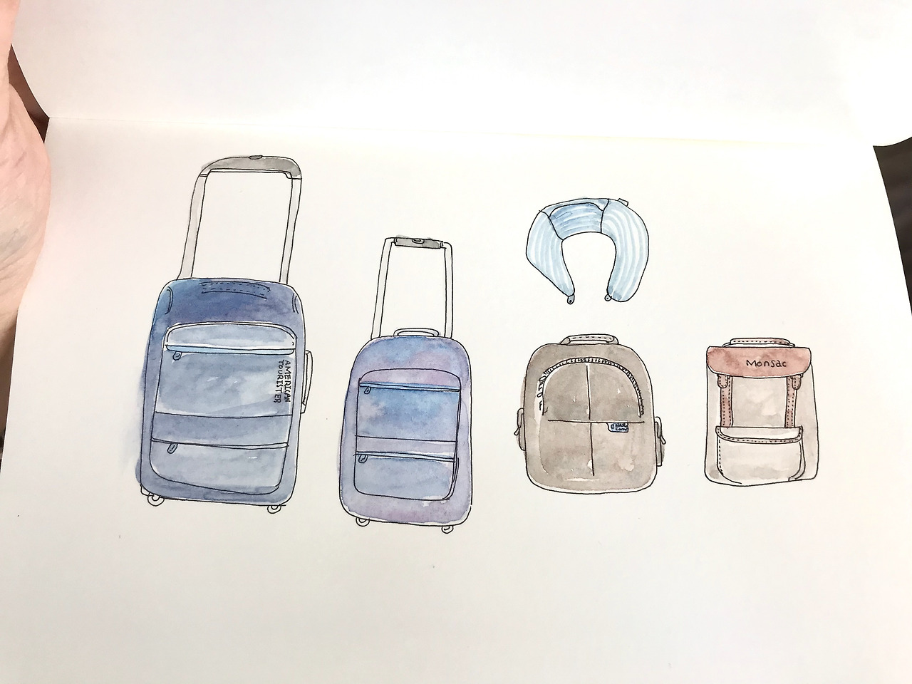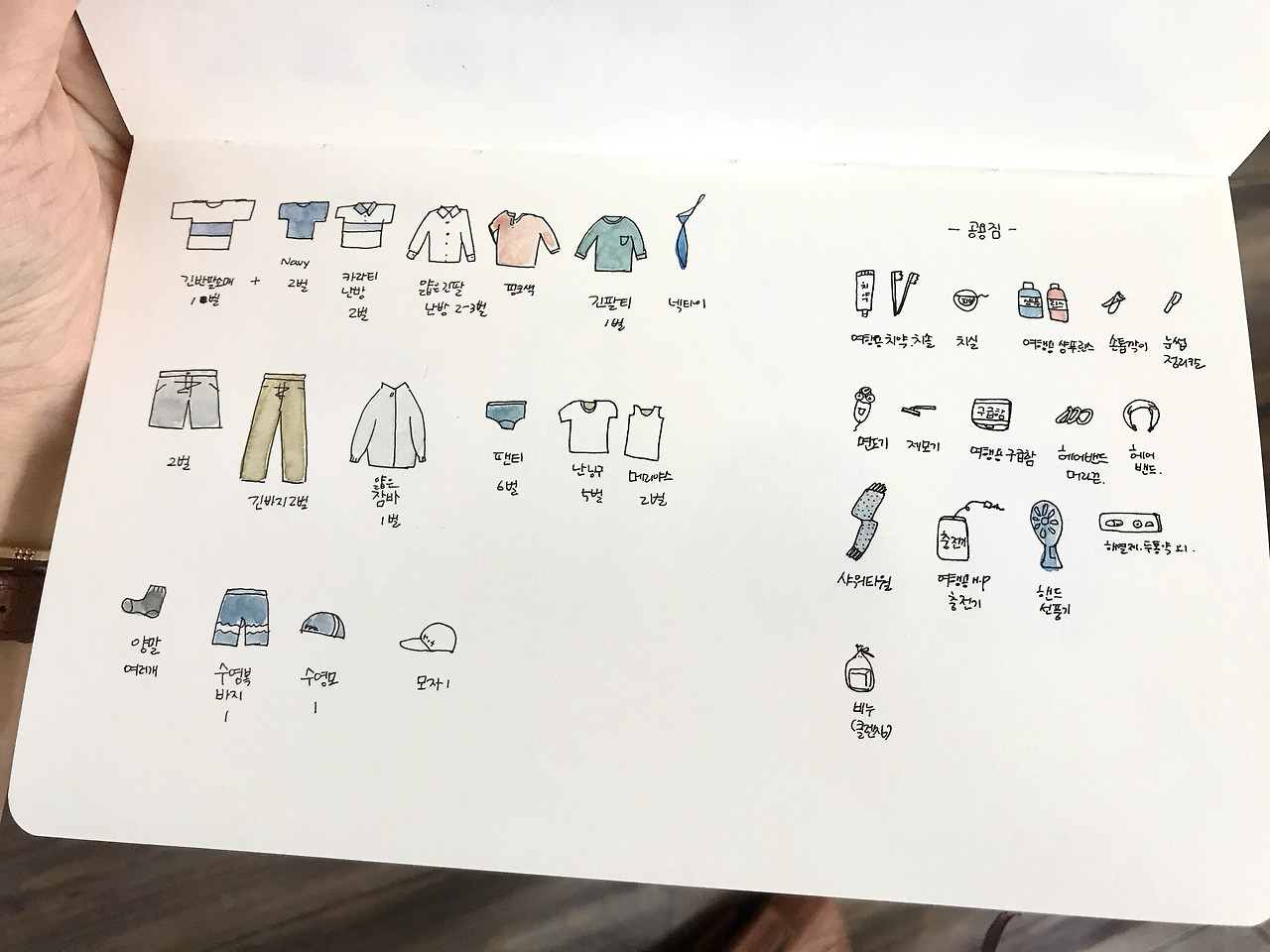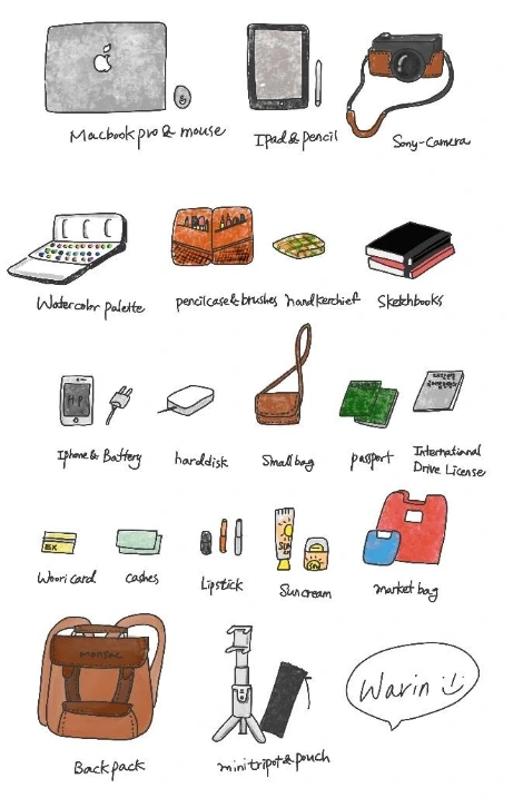 다가올 시간들을 기다리며 가방에 챙겨갈 짐들을 기록하고 꼭 필요한 것만 가져가기로 다짐하며 몇 번을 보고 또 들여다보며 가방 다이어트를 했다. 이번 여행에서 꼭 빼먹지 말자고 계획한 것 중 하나는 그림으로 여행의 기억을 기록하자는 것이었고, 하나씩 준비하니 그 과정이 참 설레기도 했다.