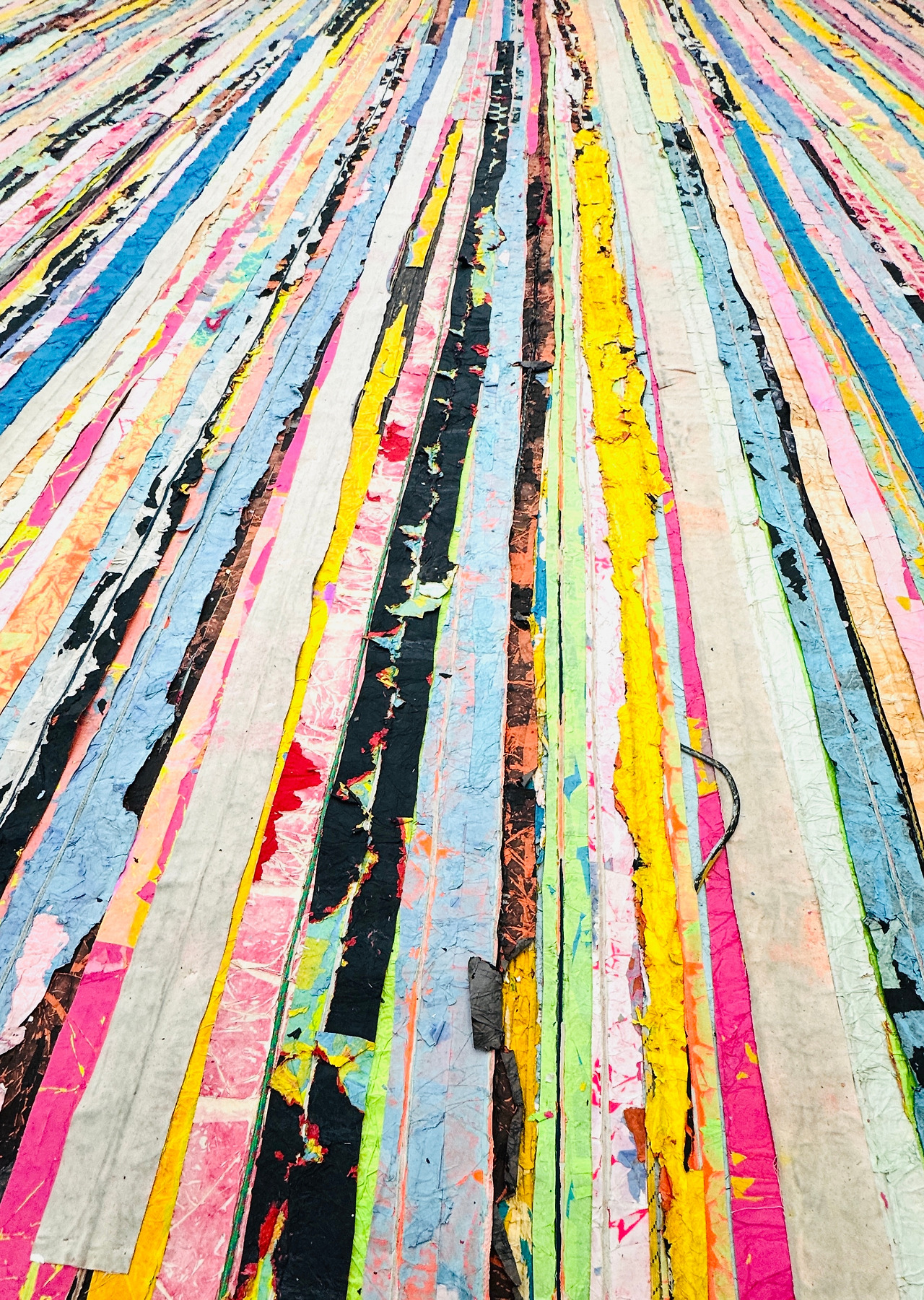 〈떠오르다(Float)〉는 캔버스, 종이, 천 등을 찢어 만든 수천 개의 띠를 노끈들로 연결해 하나의 큰 구조를 이루는 설치 작품이다.