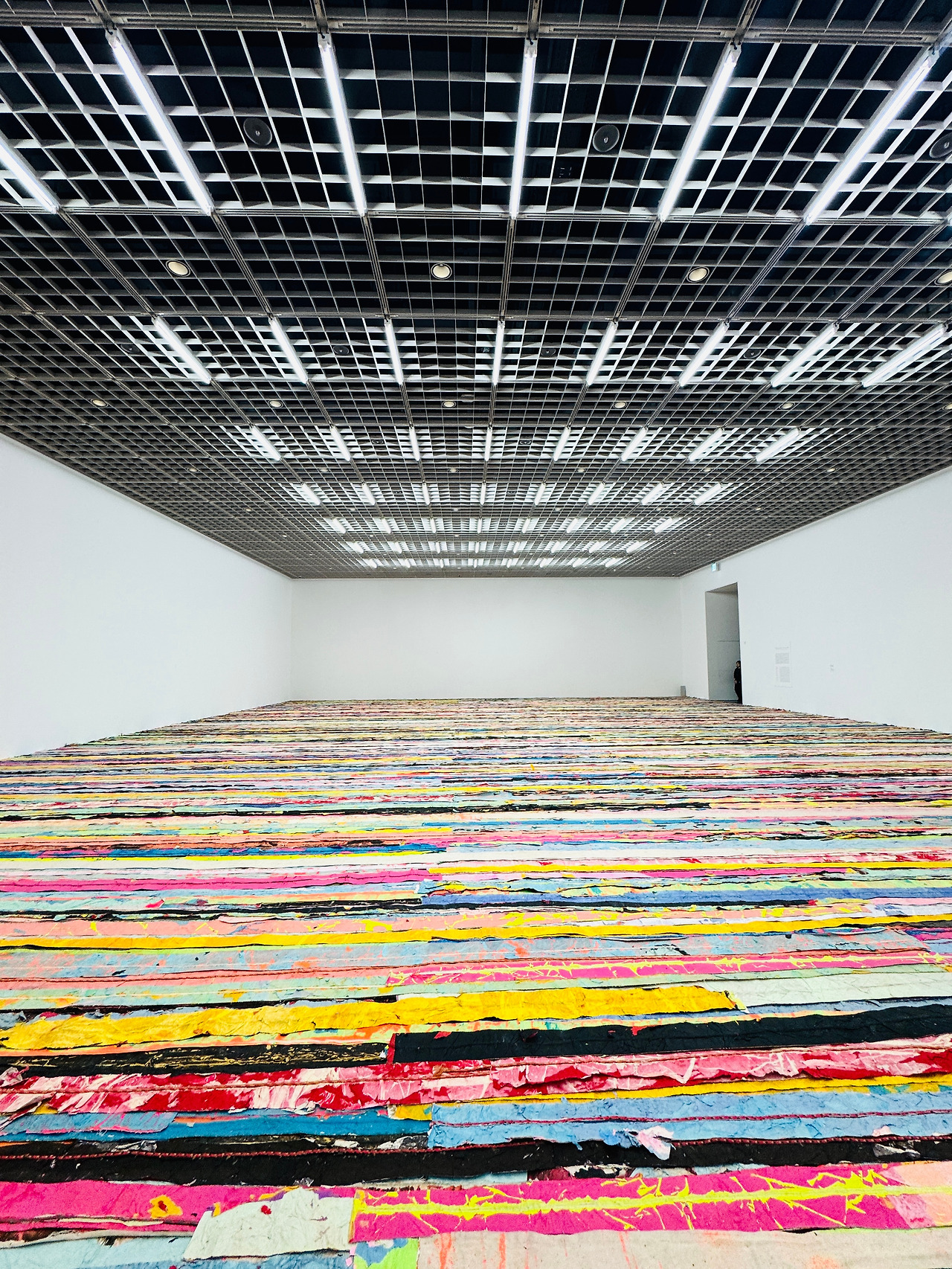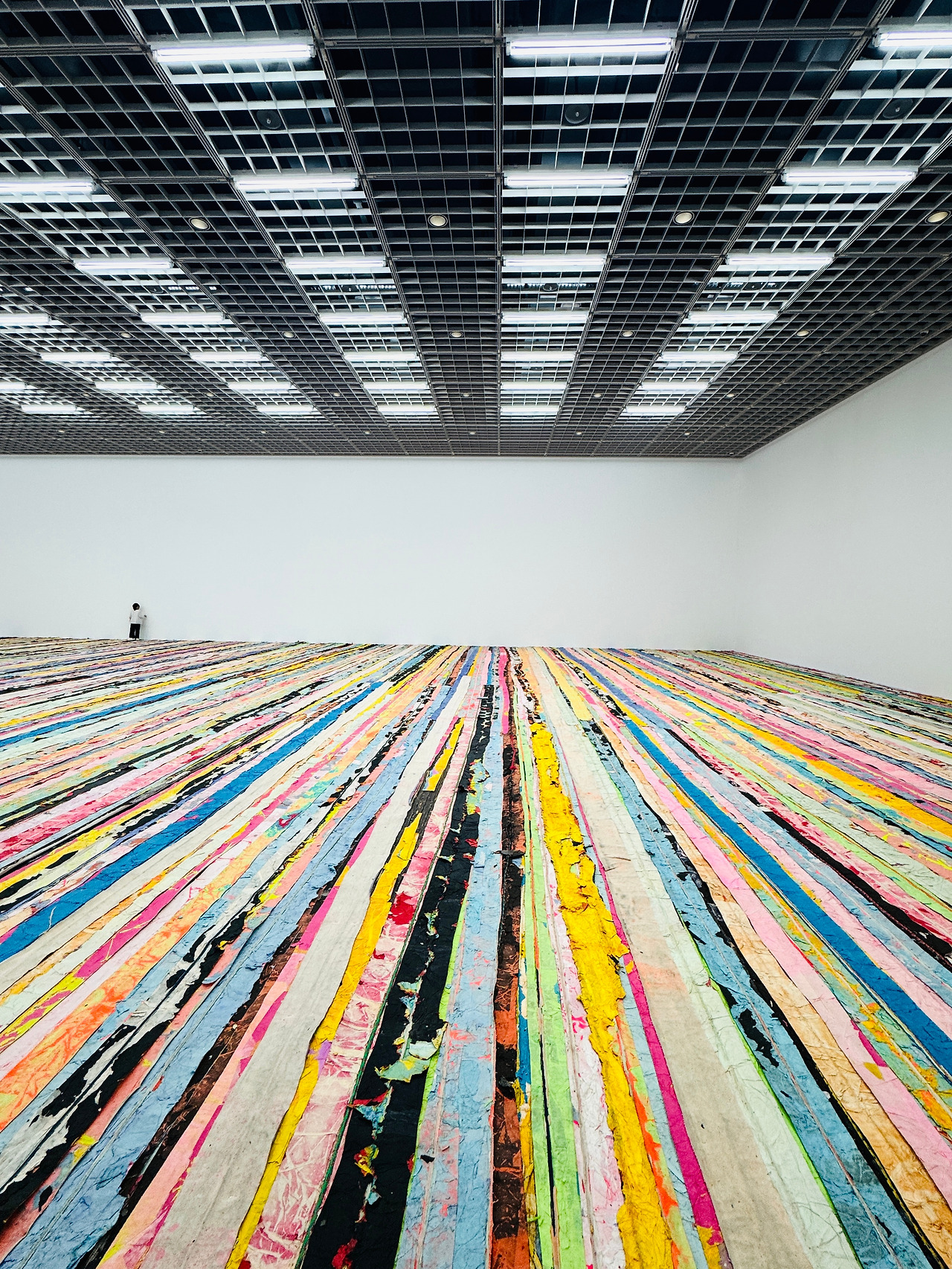 전시장 바닥 위, 겹겹이 붙여진 종이 조각들 사이로 천천히 발을 옮겼다.