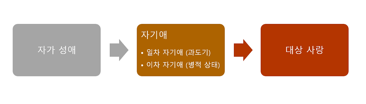 다음으로 자기애(narcissism) 단계에서는 사랑의 대상이 존재하긴 하지만, 그 대상은 자신으로 한정됩니다. 프로이트는 자기애를 일차 자기애(primary narcissism)와 이차 자기애(secondary narcissism)로 나누었어요. 일차 자기애란 자가 성애 단계의 아이가 대상 사랑의 단계로 나아가기 위해서는 한번 거쳐야만 하는 중간과정입니다. 우리 모두가 철없이 자기중심적이고 이기적이었던 유년기 시절이 있으셨을 거예요. 그랬던 때가 일차 자기애의 단계고, 이 시기는 정상적인 과정입니다. 하지만 우리는 어른이 되고 나서도 다시 자기애의 단계로 돌아오기도 해요. 대인관계에서 많은 상처들을 받다 보면 흔히 말하는 인류애를 상실한 상태가 되고, 결국에는 나를 사랑하는 것에도 급급할 때가 있거든요. 이 시기를 두고 프로이트는 이차 자기애의 단계라고 설명했습니다. 대상 사랑 단계로 넘어갔었던 우리가 다시 자기애의 단계로 퇴행하는 것이기 때문에 이차 자기애는 일차 자기애와는 달리 병적인 상태에요.