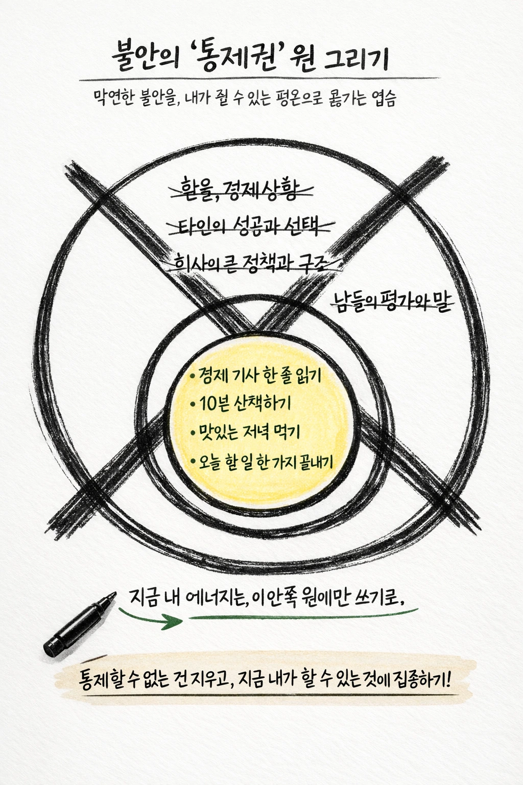 4. 시선 옮기기: 펜으로 바깥 원을 과감히 X자로 지워버리세요. 그리고 오직 안쪽 원에 적힌 일들에만 에너지를 쏟으세요.