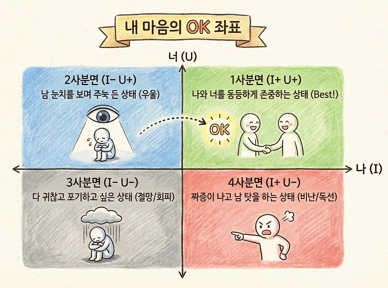 정신과 의사 토마스 A. 해리스(Thomas A. Harris)는 저서 《아임 오케이 오어 오케이》를 통해 우리가 자신과 타인을 바라보는 관점을 ‘인생 태도(Life Position)’라고 정의했습니다.