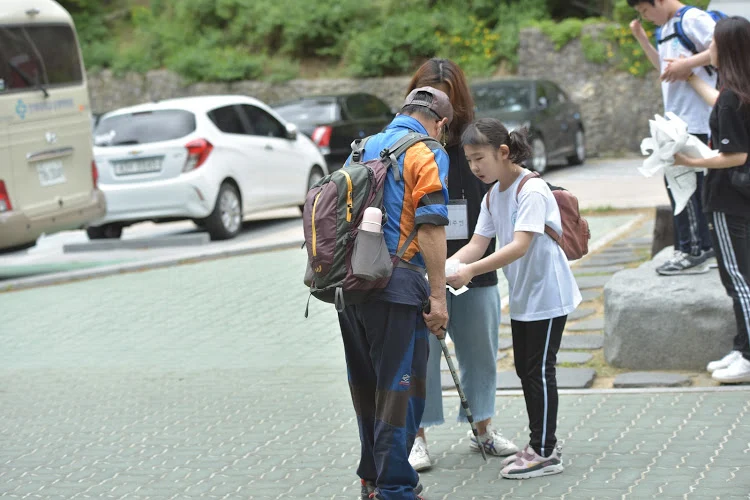 올라가는 등산객에게 인사를 합니다.
