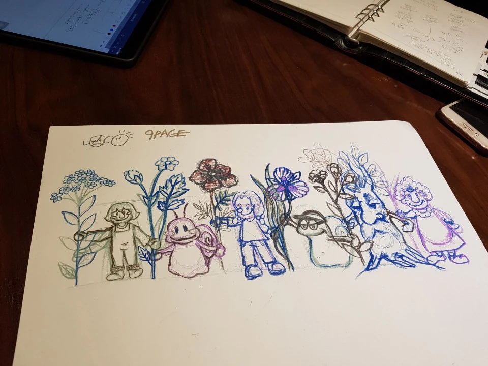 로코리기 작가님의 마지막 페이지 스케치 작업입니다. 전시회와 더불어 그 동안의 과정을 메세지를 담아 삽화로도 만들고 있습니다. 자연과 달팽이들 이웃이 모두 손잡고 있는 모습이 아마도 우리가 도달하고자 하는 모습이 아닐까 합니다.