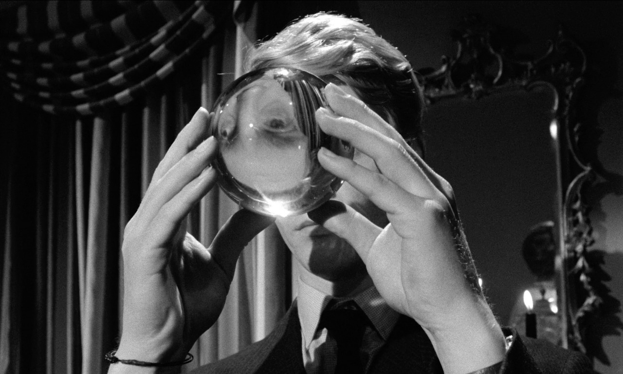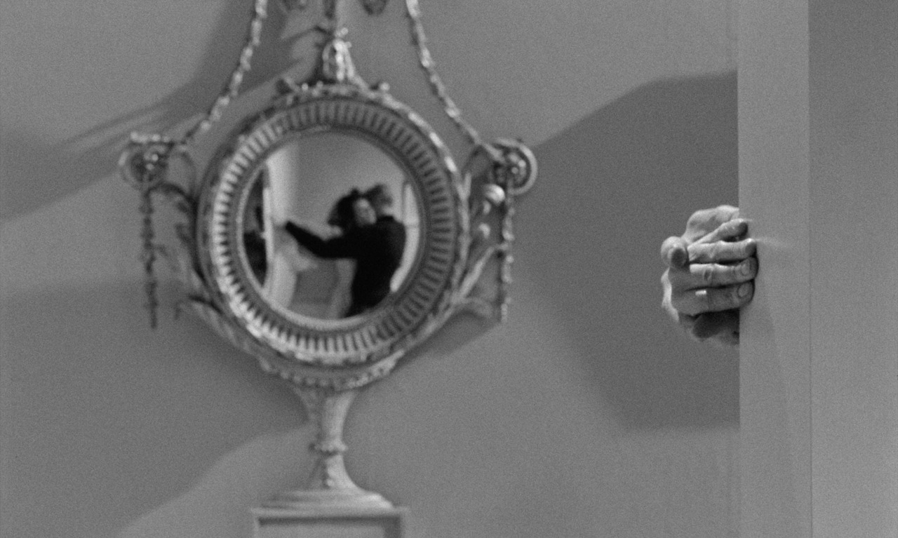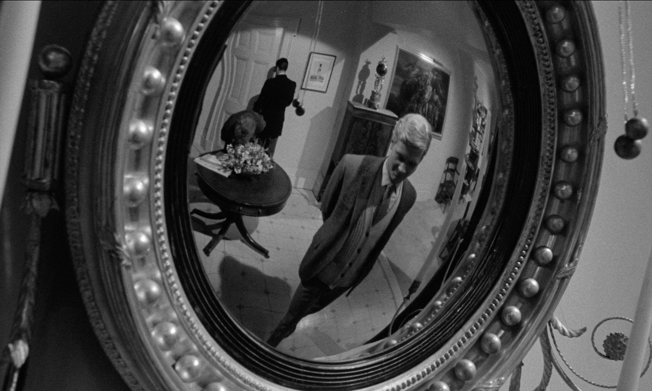 누리끼리한 포스터 정말 싫어해서 아무리 크라이테리온 버전이라도 다른 것으로 들고 오려고 했는데 이 포스터 하나만 가지고도 영화의 컨셉을 거의 다 알고 있어서 차마 빼놓을 수가 없었다. 첫째로 <하인>은 거울에 비친 상이 생명과도 같은 영화다. 둘째, 한 쪽이 올려다보고 다른 쪽이 내려다보는 이 구도는 영화 내에서 반복적으로 제시된다. 반복적으로 나오는 이 거울은 평면거울이 아니라 볼록거울이라 비친 인물들이 왜곡되게 마련이다. 그리고 이 장면은 인물 간의 비틀려진 관계도 한 번에 암시하고 있다. 첫 만남에서 배럿은 피고용자임에도 고용주인 토니를 내려다본다.(장면 1) 하인임에도 하인의 자세가 아니고 주인임에도 주인의 위치가 아니다. 이들이 통상적인 고용주-피고용자 관계와는 다른 관계임을 암시하고 있다.