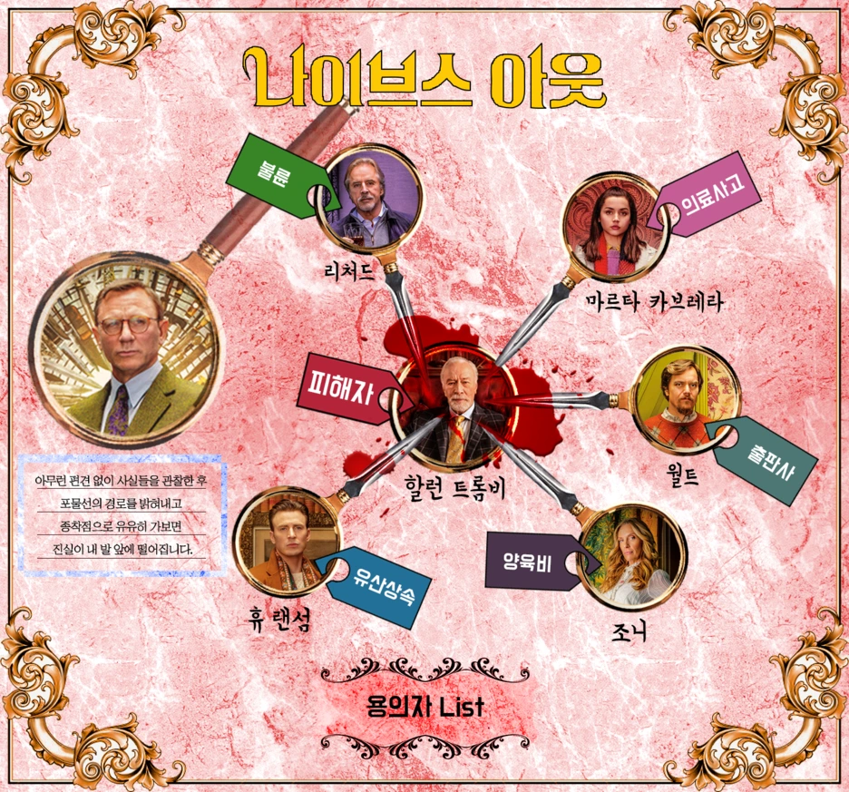 나이브스 아웃은 전형적인 후더닛(whodunit : 탐정 소설) 장르의 특징을 가지고 있는 영화이다.