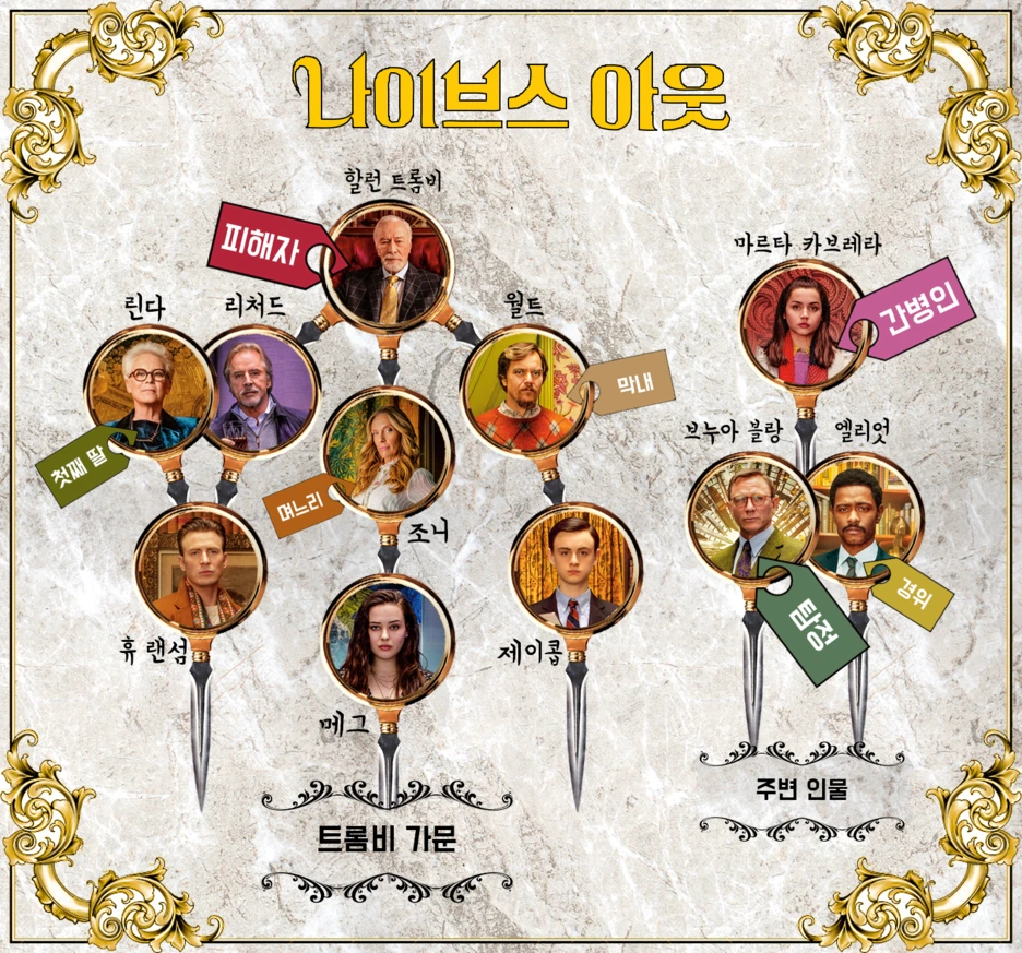 나이브스 아웃은 할런 트롬비라는 인물을 중심으로 할런의 죽음에 대해서 브누아 블랑이라는 유명 탐정이 조사를 해나가는 스토리이다.