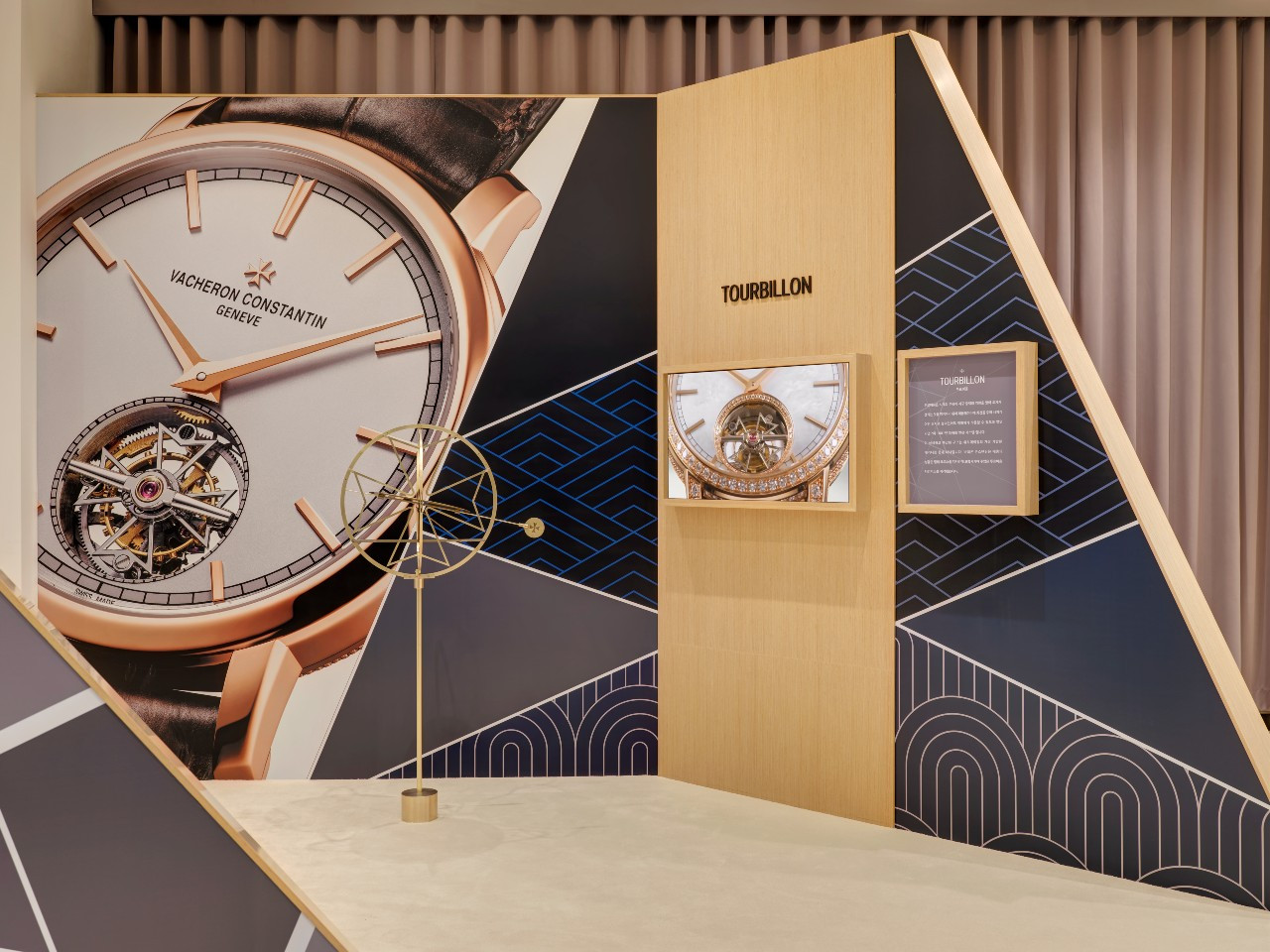 바쉐론 콘스탄틴의 투르비용은 메종의 엠블럼인 말테 크로스 디자인이 적용된 점이 특징이다. 메종의 아름다운 투르비용 시계들은 벽면의 영상뿐만 아니라 쇼케이스에서도 확인할 수 있다.