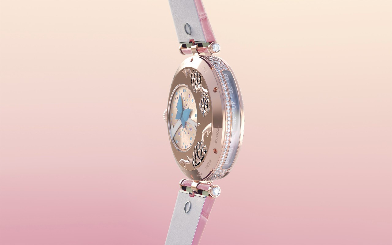 화이트 골드 또는 로즈 골드 소재로 완성된 백 케이스에는 모델에 따라 꽃과 구름 그리고 잠자리 등이 인그레이빙되어 있다. 백 케이스의 9시 방향에 배치된 사파이어 크리스털에는 구름과 잠자리 또는 푸른색의 나비를 미니어처 페인팅해 무브먼트의 로터가 신비롭게 구동하는 것 같은 분위기를 연출한다.