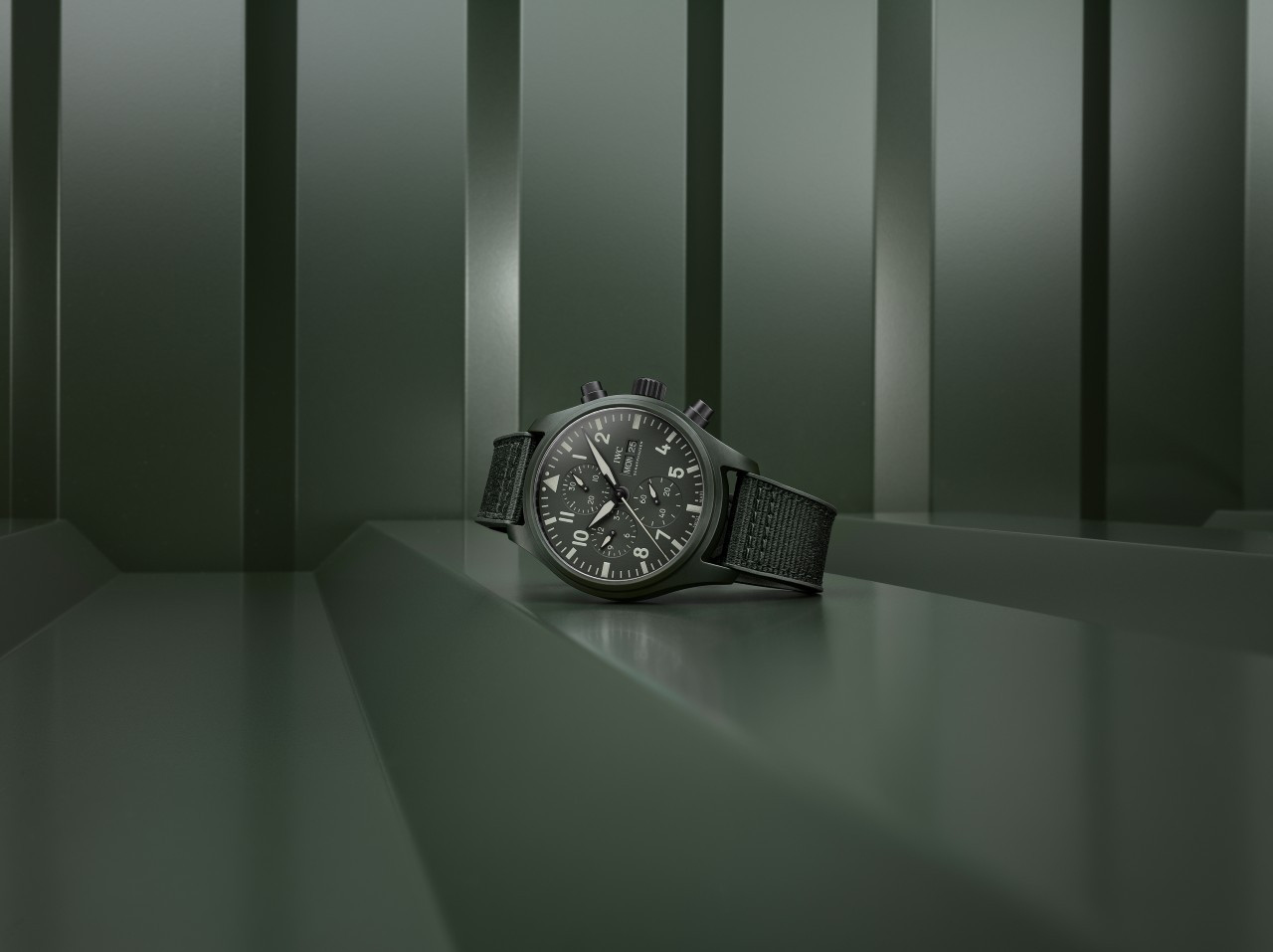 ‘레이크 타호’ 에디션과 함께 공개된 ‘우드랜드’ 에디션은 해군 파일럿의 비행복을 그리고 삼림 지대를 연상시키는 올리브 그린 컬러 세라믹으로 제작되었다. 다이얼은 케이스와 동일하게 그린 컬러가 매치되었고, 가시성을 높이기 위해 인덱스와 핸즈에는 한 단계 밝은 그린 컬러로 입힌 뒤 슈퍼 루미노바로 코팅 처리했다. 크라운과 크로노그래프 푸셔 그리고 백 케이스는 IWC가 직접 개발한 매트한 블랙 세라타늄 소재로 제작되었다. 이 시계에 사용된 세라타늄은 티타늄과 세라믹을 결합한 합성 소재로 가벼운 중량과 뛰어난 견고함은 물론, 스크래치 방지 효과까지 아우르는 점이 특징이다. 우드랜드 에디션은 텍스타일 패턴이 새겨진 그린 컬러의 러버 스트랩과 함께 만나볼 수 있다.