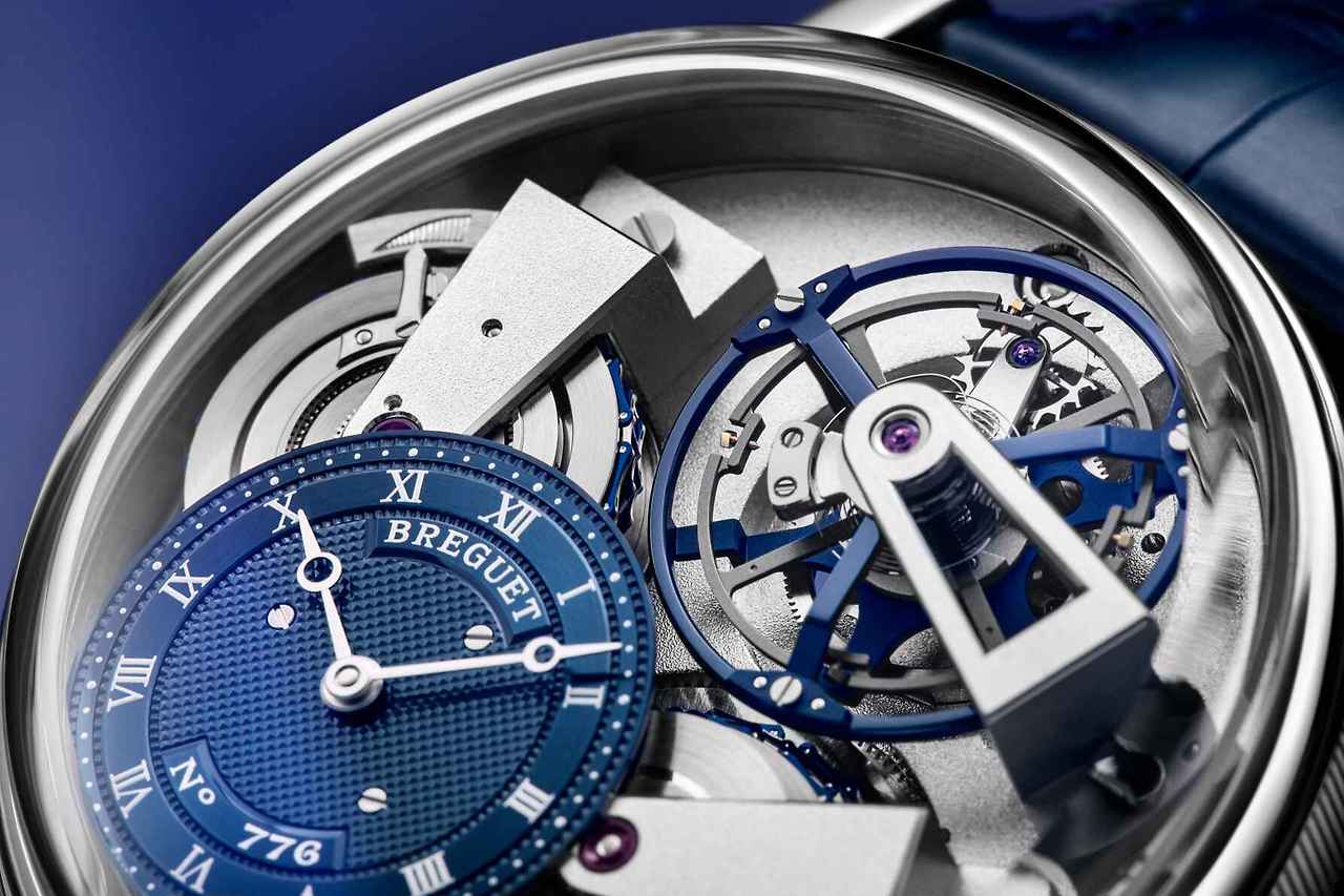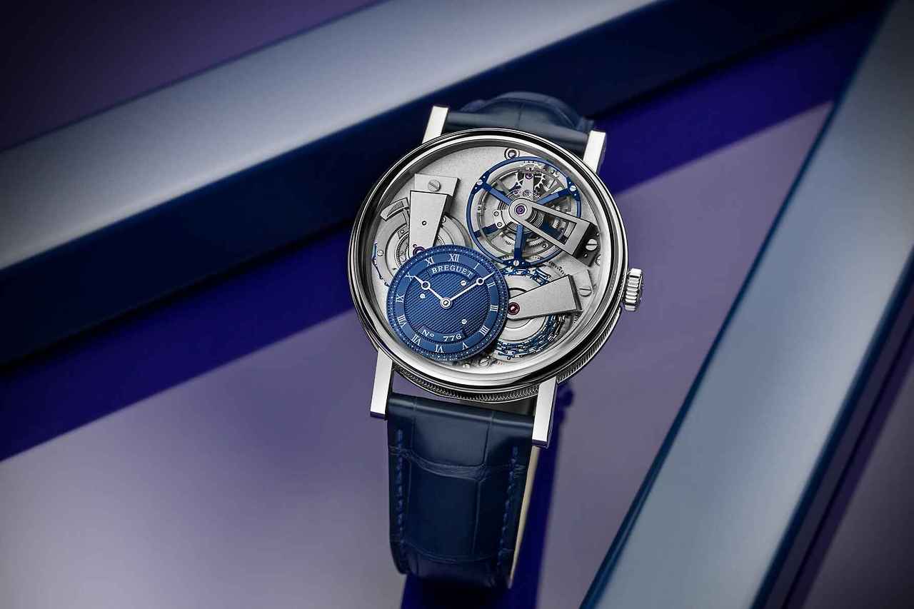 새로운 트래디션 투르비용 7047은 직경 41mm 사이즈의 플래티넘 소재로 제작되었다. 다이얼에는 완벽한 대칭을 아우르는 무브먼트의 구조를 고스란히 드러내며 트래디션 컬렉션의 미학적 상징을 반영했다. 다이얼의 1시 방향에는 블루 컬러로 코팅된 투르비용 케이지가 위치하고 있는데, 퓨제 체인 투르비용 메커니즘이 적용되어 5시와 8시 방향 사이에 배치된 배럴을 통해 동력을 얻는다. 블루 컬러로 완성된 체인은 와인딩 상태와 관계없이 일정한 속도로 움직이며 와인딩 상태에 따라 큰 오차가 발생하는 것을 방지해준다. 또한 9시 방향의 위치한 배럴의 상단에는 브레게가 특허받은 파워 리저브 인디케이터가 배치되었다.