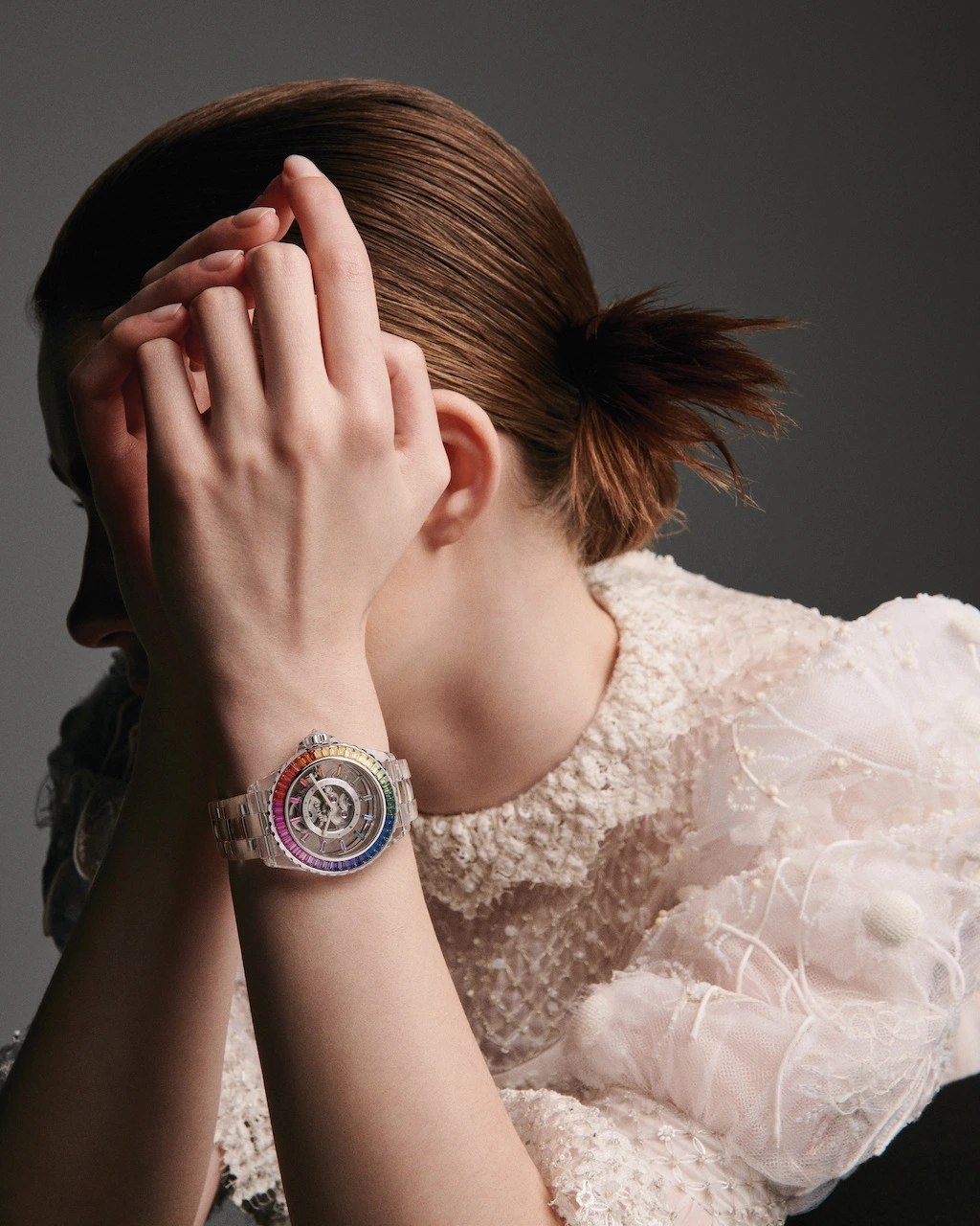 샤넬은 1990년대 일렉트로 문화의 그래픽 코드를 특징으로 하는 캡슐 컬렉션 샤넬 일렉트로를 선보이며 흑과 백의 J12 타임피스에 레인보우 컬러를 장식했다. 그중 단 12점만 선보이는 ‘J12 엑스레이 일렉트로’에는 직경 38mm의 사파이어 크리스털과 화이트 골드로 제작한 케이스에 샤넬의 인하우스 무브먼트인 칼리버 3.1을 탑재했다. 투명한 베젤에는 46개의 무지개 컬러의 바게트 컷 사파이어를 세팅했고, 인덱스에도 12개의 바게트 컷 사파이어를 세팅해 컬러 포인트로 시간을 알려준다. 화이트 골드로 제작한 크라운에는 브릴리언트 컷 다이아몬드를 세팅하고, 브레이슬릿은 사파이어 크리스털 소재의 칼리버 3.1과 동일한 소재인 사파이어 크리스털 링크를 사용해 투명성을 강조했다.