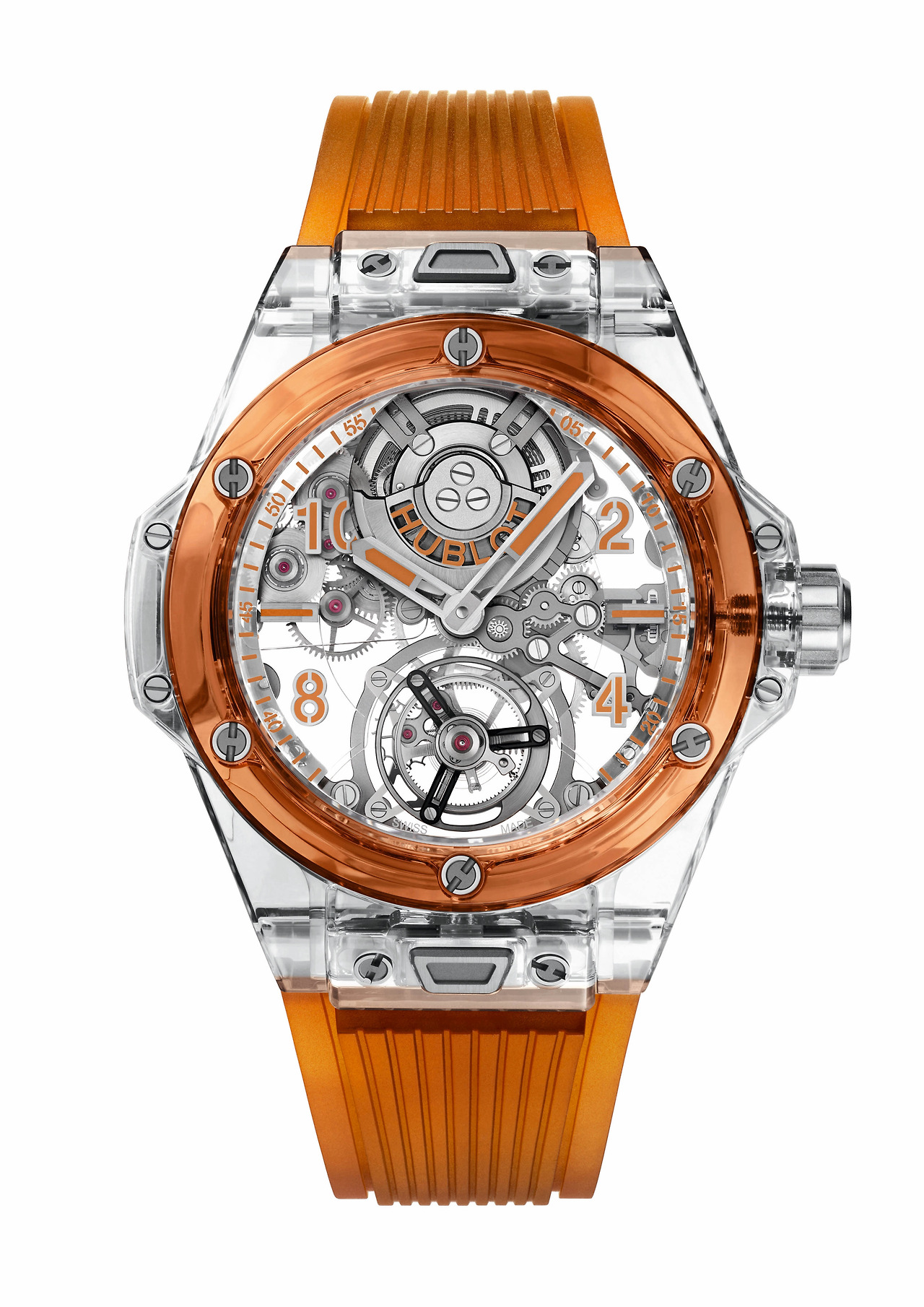 위블로 역시 올해 신제품 중 하나인 ‘빅뱅 투르비용’을 온리워치로 선보였는데, 오토매틱 투르비용 무브먼트를 장착한 이 사파이어 시계는 본래부터 오렌지 컬러의 사파이어로 제작한 점이 특징이다. 위블로는 온리워치만의 특별함을 위해 백 케이스에 온리워치라는 글자를 새기고, 특별한 사파이어 케이스도 함께 제공한다.